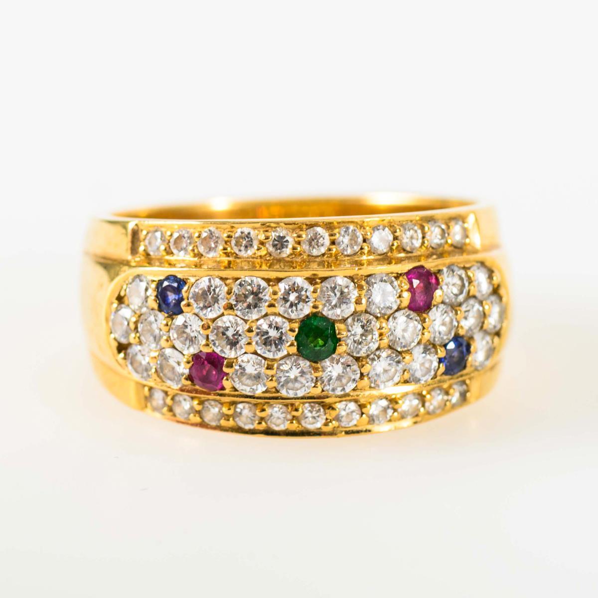 Breiter Reif mit 48 eingelassenen Brillanten, 2 Saphiren, 2 Rubinen und 1 Smaragd.