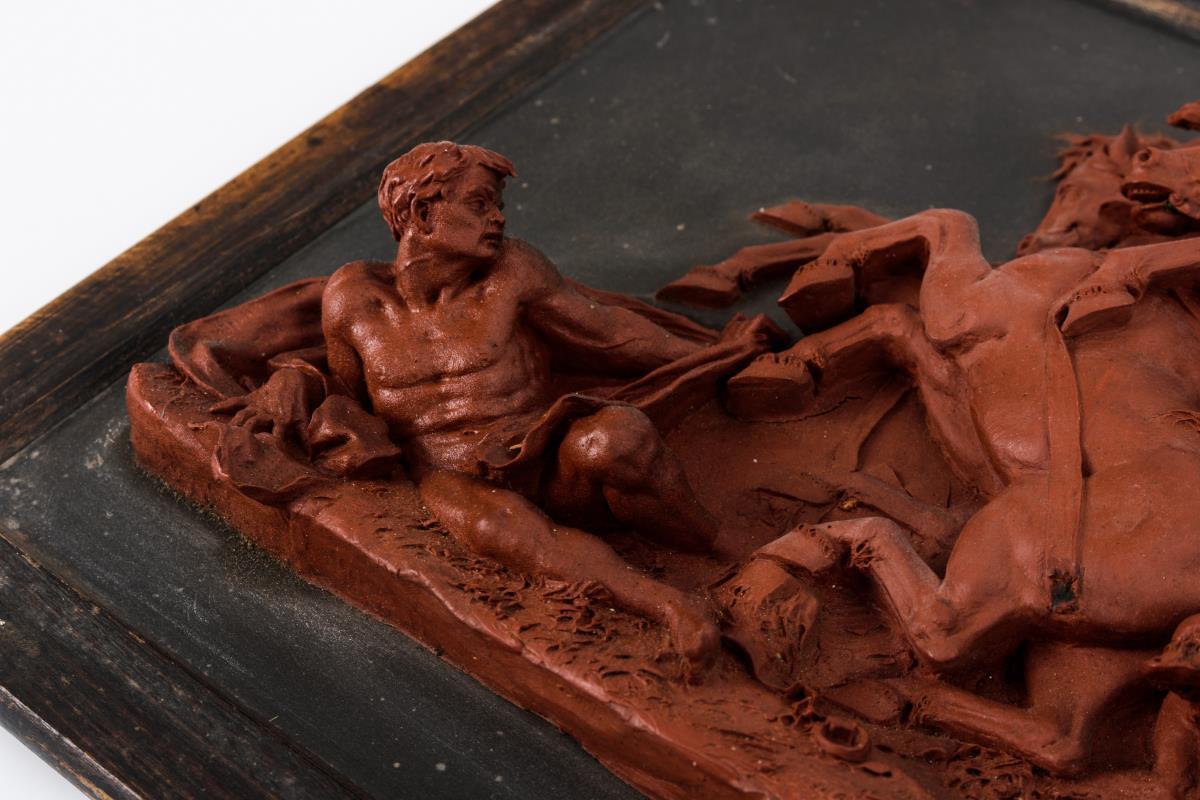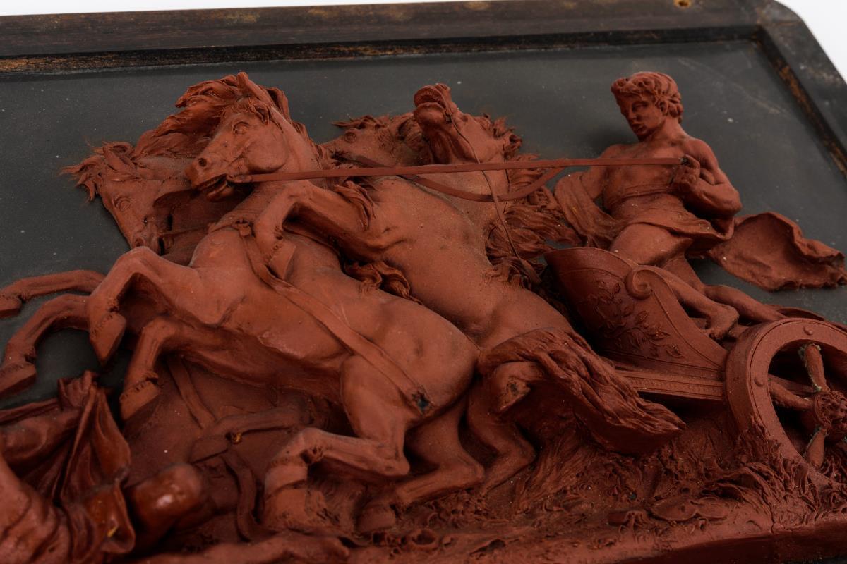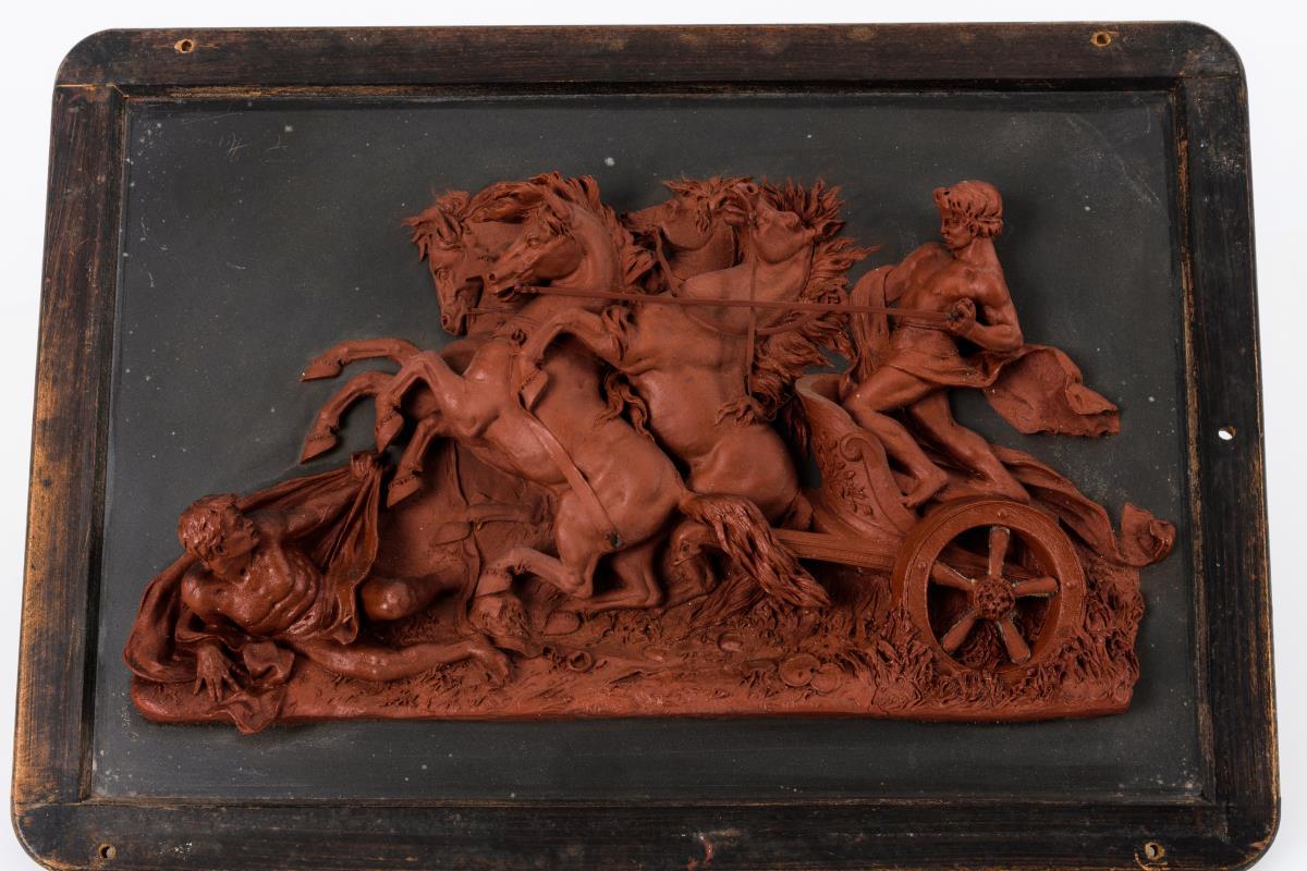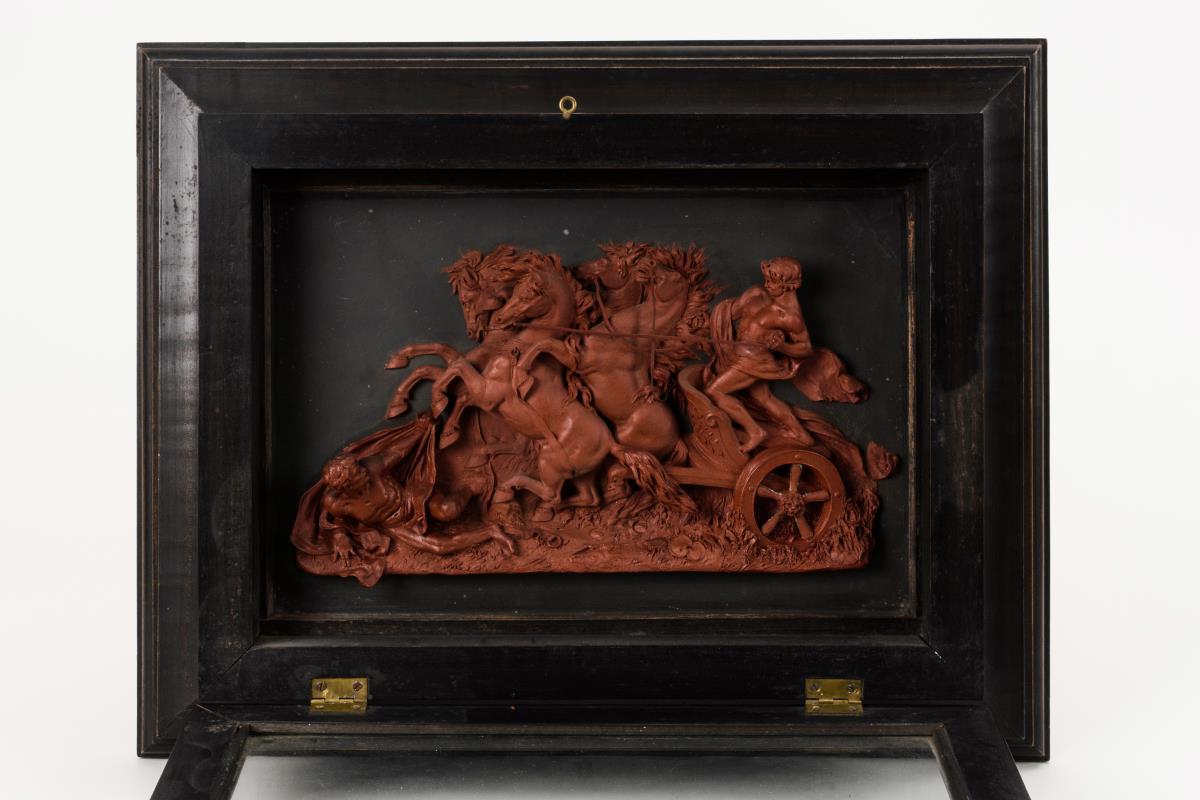 Wachsbossierung: Dramatische Szene mit einem Streitwagen (Pelops und Oinomaos?)