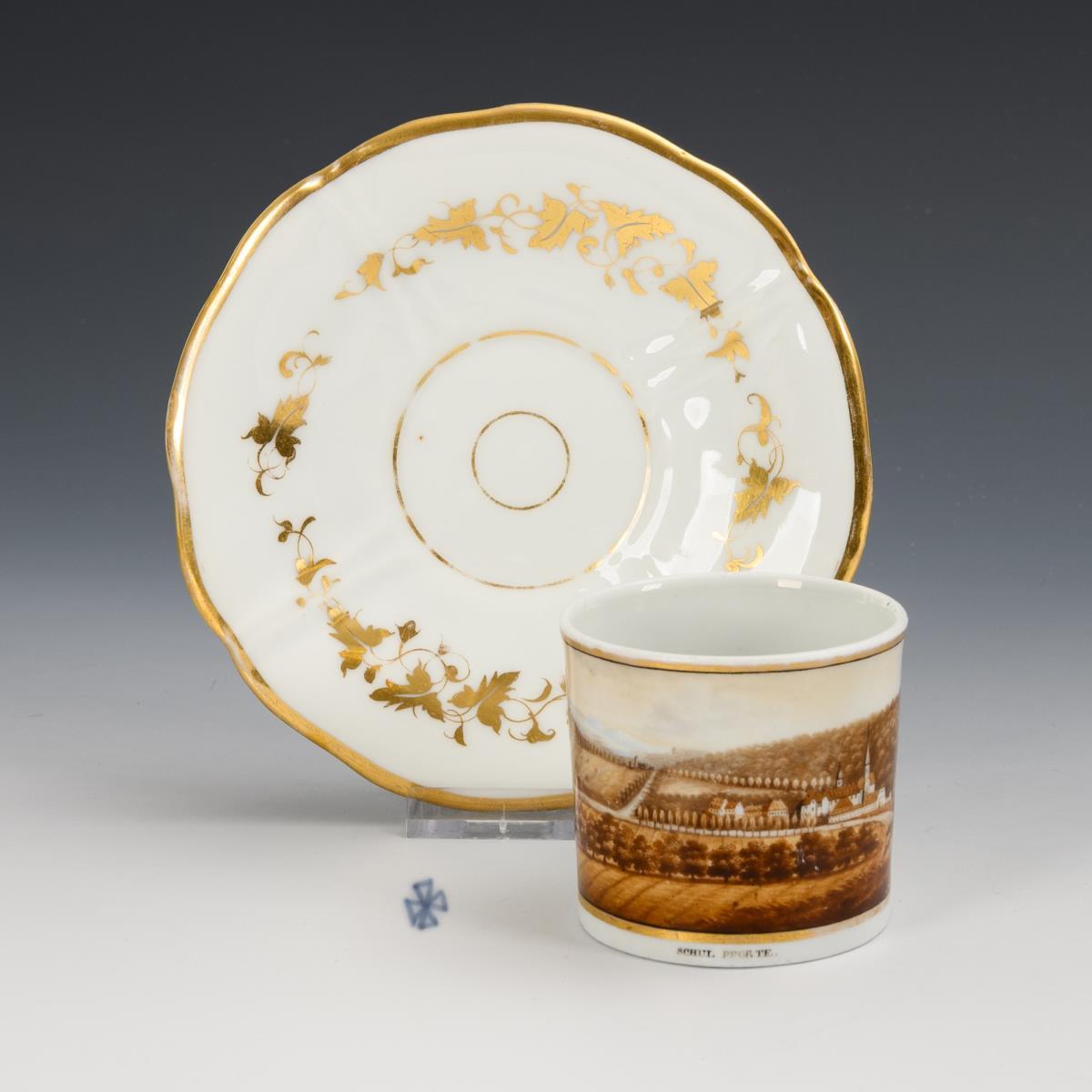 Zylindertasse mit gewinkeltem Henkel. Schauseitig eine goldgerahmte Rechteckkartusche mit der bezeichneten Ansicht der Landesschule Pforta bei Bad Kösen. Henkel und Tassenboden restauriert.