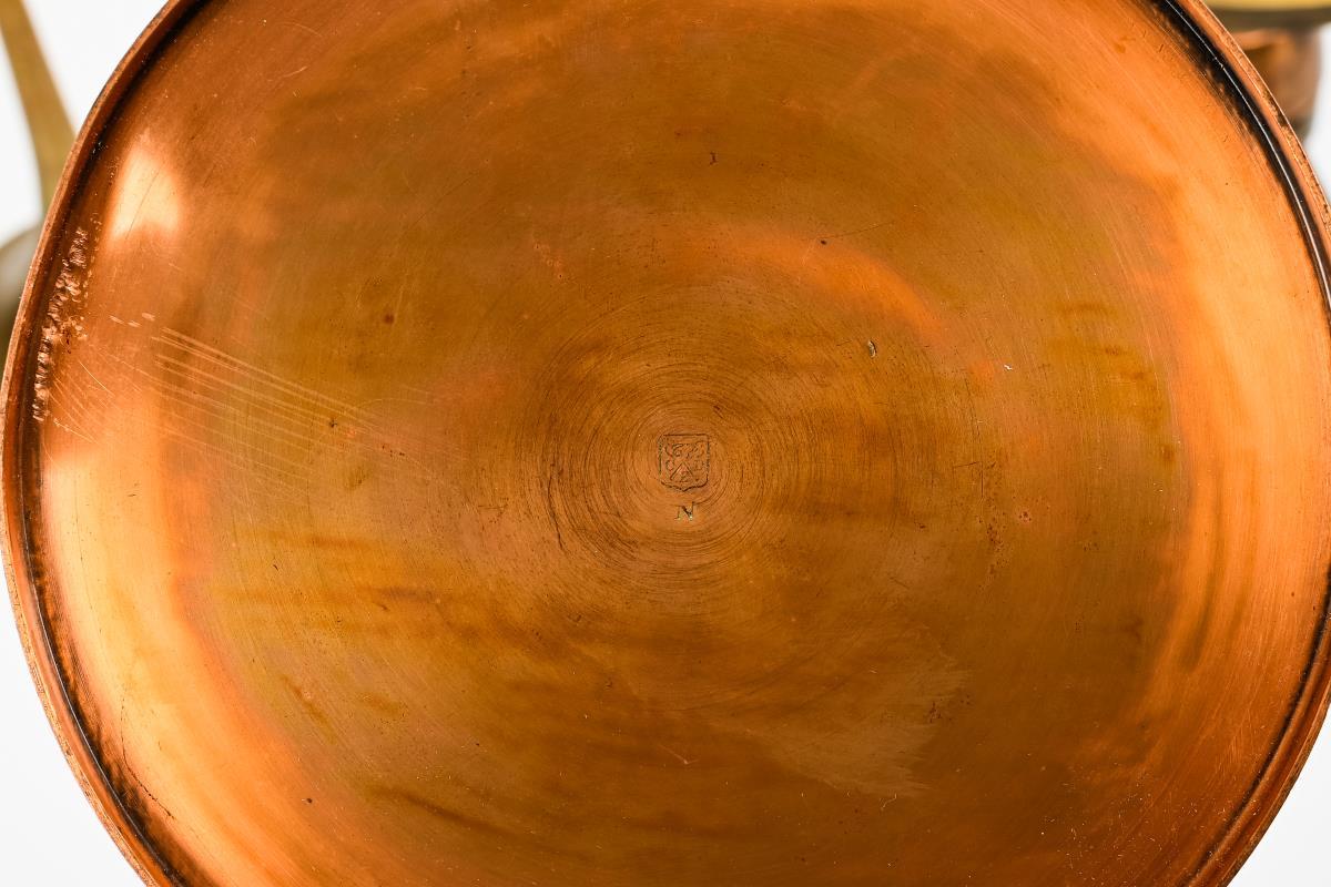 Kupferblech, Messingguss, Rohrgeflecht. / Pokal Messingblech teils emailliert. Je innen verzinnt. H gesamt 35 bzw. 33 cm.