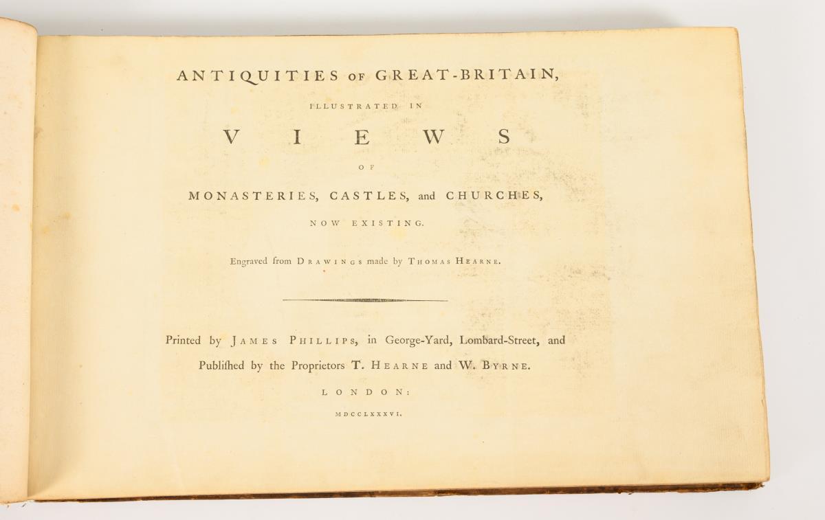 Gestochen von W. Byrne und ungenannt nach Zeichnungen von Thomas Hearne. Zahlreiche Stiche mit ausführlichen Beschreibungen in Englisch und Band zwei auch in Französisch. Beide in unterschiedlichen Ledereinbänden, einer mit Goldschnitt. Vollständig mit 51 und 32 Ansichten. Ein Einbanddeckel lose, schwach stockfleckig, Altersspuren.