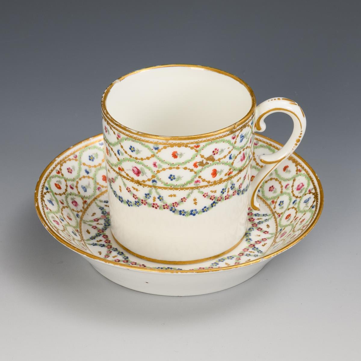 Zylindertasse mit Ohrenhenkel. Auf der Wandung über sich überschneidenen Blütenfestons Streublümchen in grünen und goldenen Blattranken. Geklebter Randchip an der Tasse, Haarriss am Untertassenrand, partieller Goldabrieb.