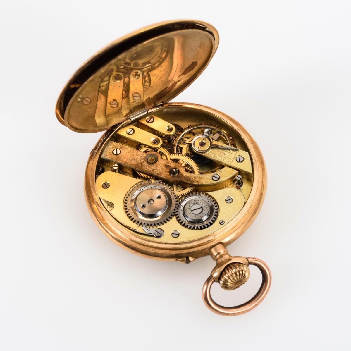 14 k, Schweizer Beschauzeichen gepunzt, Staubdeckel aus Metall. Ø 4,9 cm. 73 g.