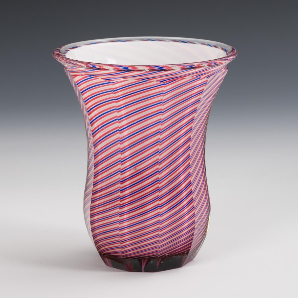 Farbloses Glas mit weißopakem Innenfang über weiß-rot-blauen, spiralig angeordneten Fäden. H 12 cm.