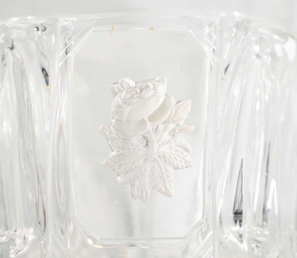 In Schliffoptik formgeblasener Becher mit schauseitig hochgeschliffener Kartusche mit eingeschmolzener Rose aus Glaspaste; ausgekugelter Abriss.