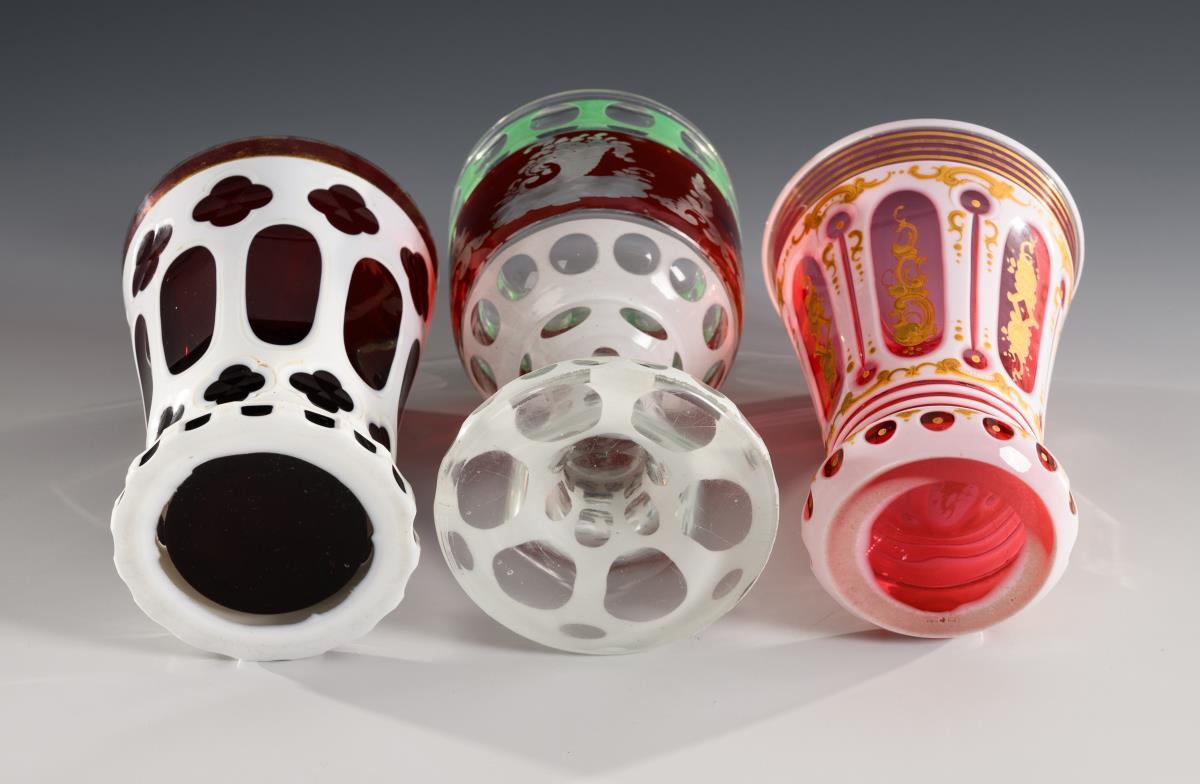 1x Fußbecher aus rubinrotem, weiß überfangenem Glas mit Linsen- und Olivenschliff (H 12,5 cm). / 1x Fußbecher aus Rosalinglas mit weißem Überfang, Linsen- und Olivenschliff sowie email- und goldgemalten Rocailleelementen (H 13 cm). / 1x Römer aus farblosem, teils rot gebeiztem Glas mit Linsen- und Olivenschliff, hellgrüner und weißer Emailmalerei sowie gravierten Symbolarrangements (H 15,5 cm). Gold teils berieben.