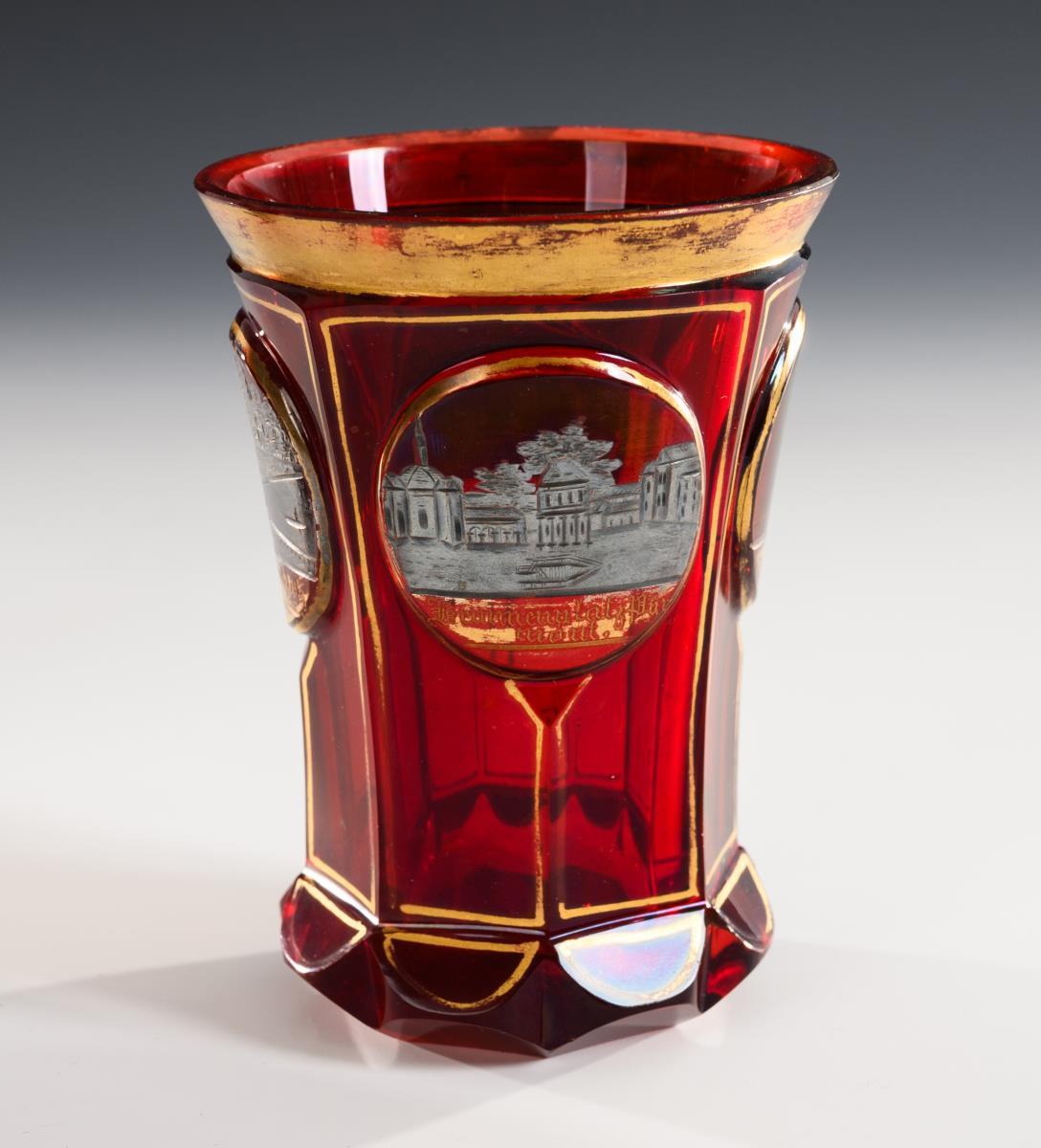 Facettierte Gläser, davon 2 Becher mit gravierten sowie silber- und goldstaffierten Ansichten von Bad Pyrmont bzw. Hannover und 1 Kelchglas mit silbergemalten Streublümchen und Rocaillen. Gold und Silber teils berieben.