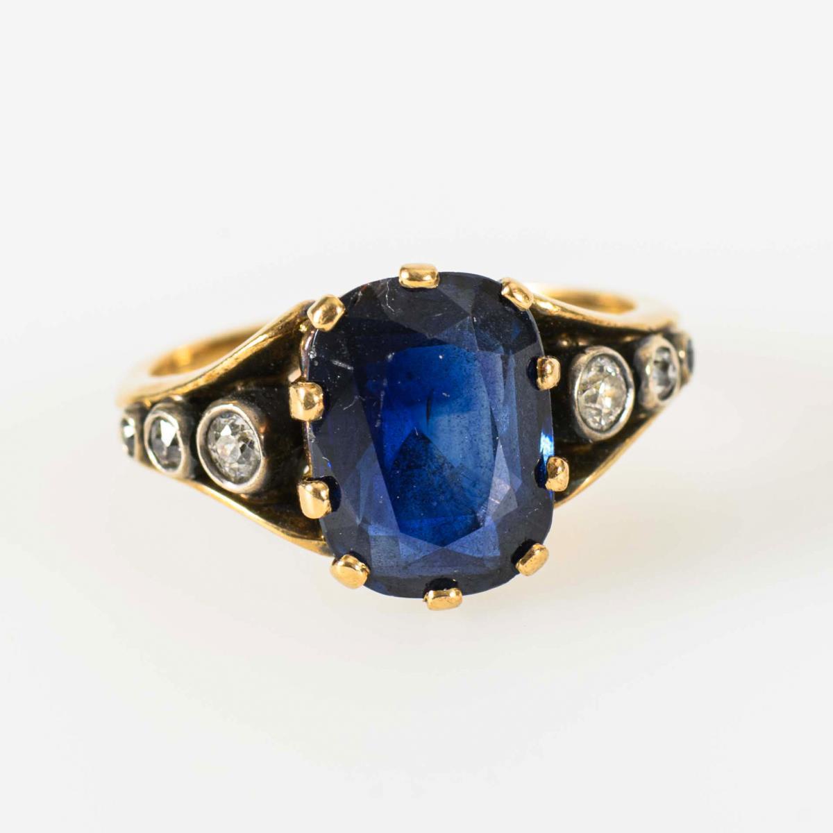 Ring mit Saphir und Altschliffdiamanten um 1900.