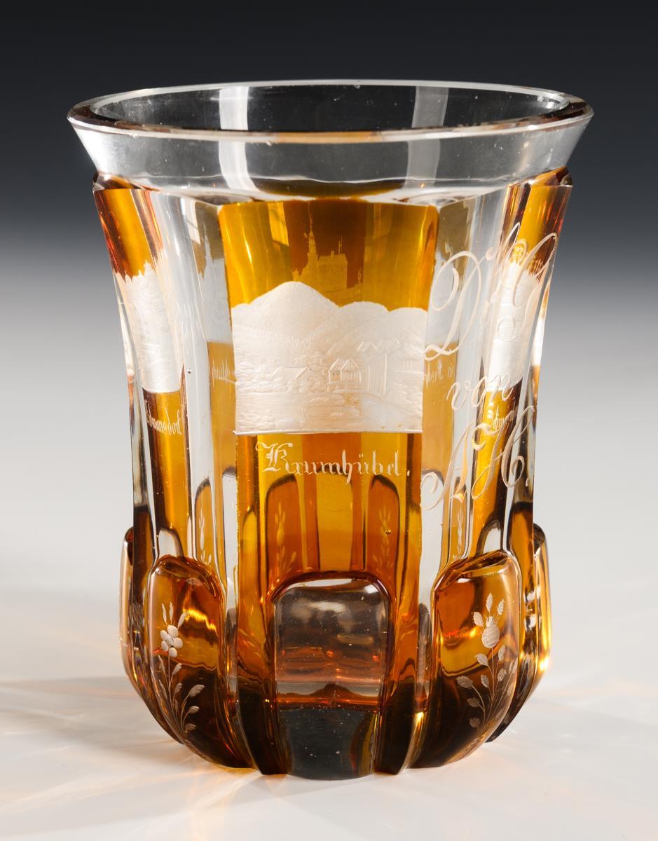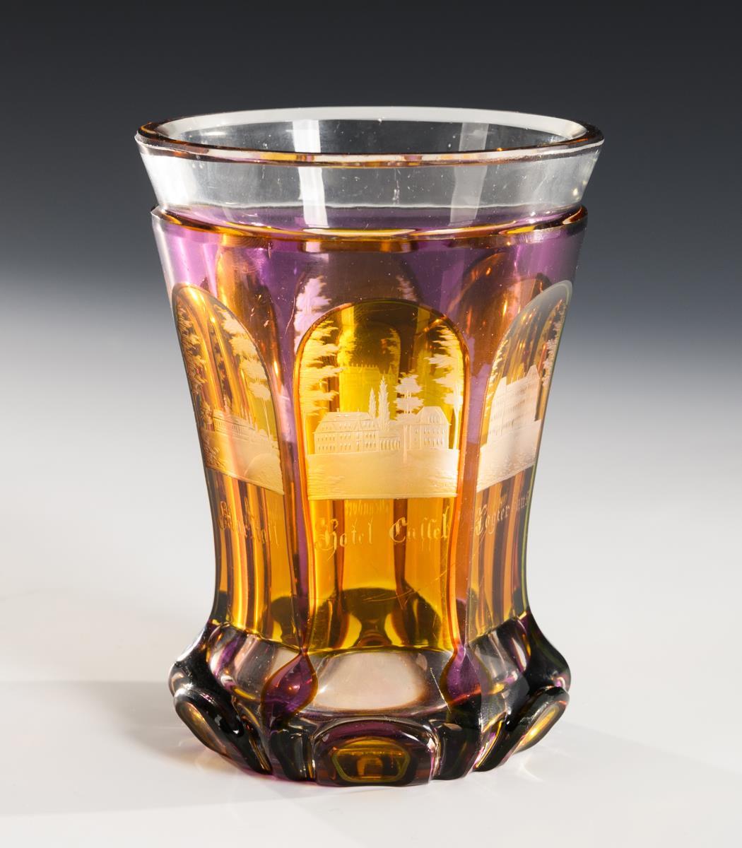 1x Fußbecher aus farblosem Glas mit violettem Überfang, Gelbbeize und gravierten Ansichten von Nenndorf auf geschliffenen Zungen. / 1x Kelchglas aus farblosem Glas mit rubinrotem Überfang, partieller Gelbbeize und gravierten schlesischen Ansichten in geschliffenen Linsen (u.a. Erdmannsdorf, Hirschberg, Fischbach, Warmbrunn, Stonsdorf). / 1x facettierter Becher aus farblosem, teils gelb gebeiztem Glas mit hochgeschliffenen Zungen am Stand sowie gravierten schlesischen Ansichten (Erdmannsdorf, Fischbach, Krummhübel, Schweizerhaus). 1x minimale Bestoßung am Mündungsrand, 1x Bestoßung am Fußrand.