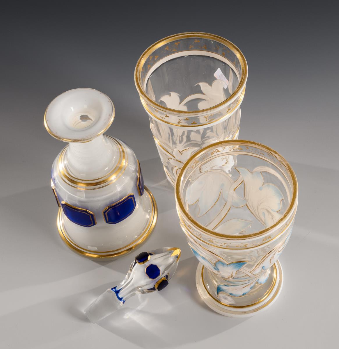 1x teils facettierter, konischer Becher aus farblosem Glas mit weißem Überfang und geschliffenem, goldstaffiertem Floraldekor (H 12,5 cm). / 1x Fußbecher aus farblosem Glas mit weißem Überfang und geschliffenem gold- und türkisfarben staffiertem Floraldekor (H 12,5 cm). / 1x kleine Karaffe aus farblosem Glas mit Milchglasinnenfang und kobaltblauem Überfang, facettierter Stopfen und hochgeschliffene Rechteckfelder auf Korpus und Stopfen, goldstaffiert (H 19,5 cm). Gold teils etwas berieben, Stopfenspitze minimal bestoßen, Chip am Stand eines Bechers.
