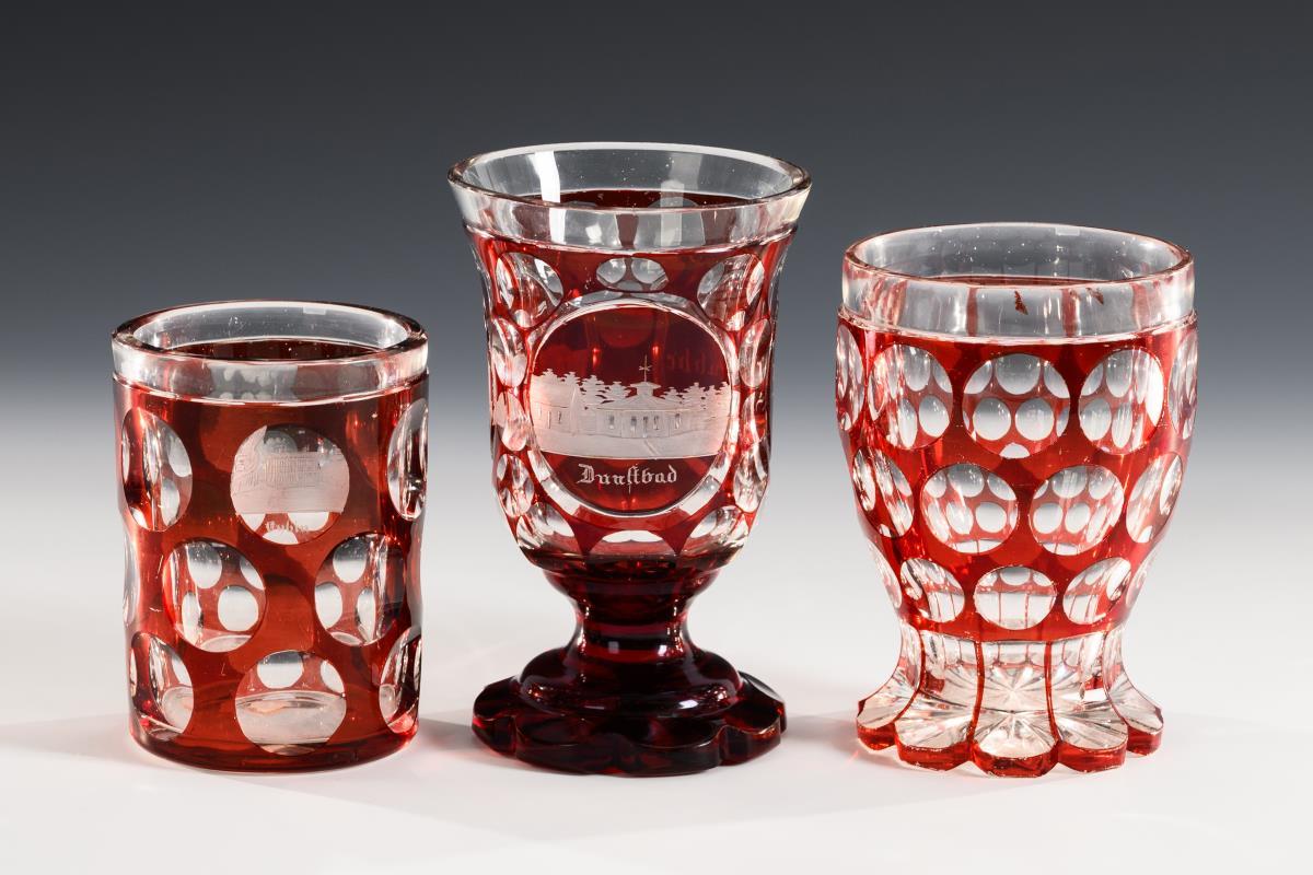 2 Ansichtengläser (Oybin, Oeynhausen) und 1 Fußbecher mit Facetten- und Linsenschliff. 1x Bestoßungen am Fußrand.