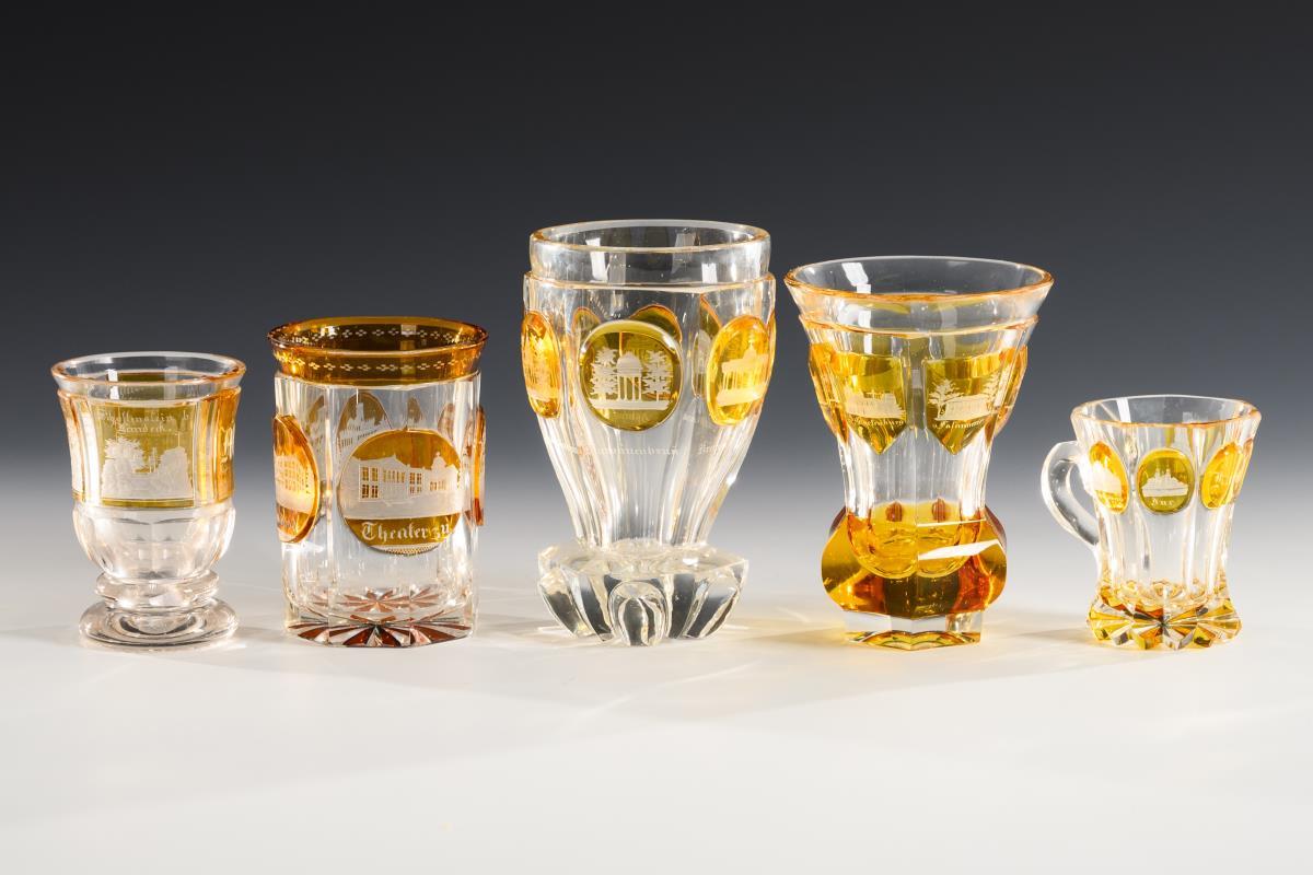 2 Ranftbecher, 1 Zylinderglas, 1 Kelchglas und 1 Henkelbecher mit Schliffdekor und gravierten Ansichten (Teplitz, Marienbad, Kynast, Landeck, Dux). Beschliffene Randbestoßung am Zylinderbecher.