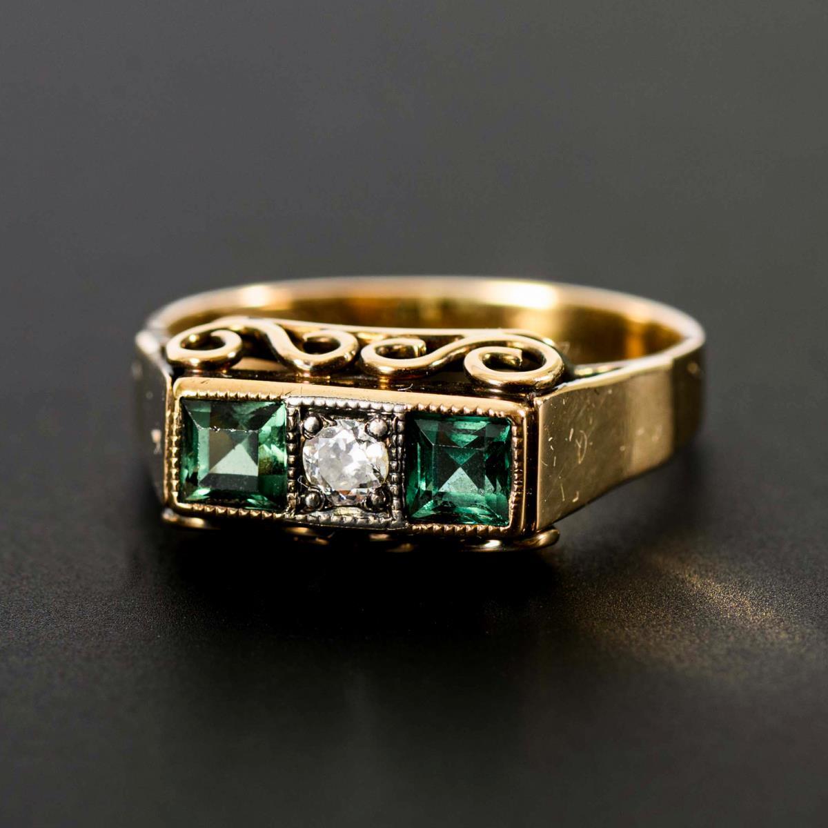 Art-déco-Ring mit Turmalinen und Altschliff-Brillant.