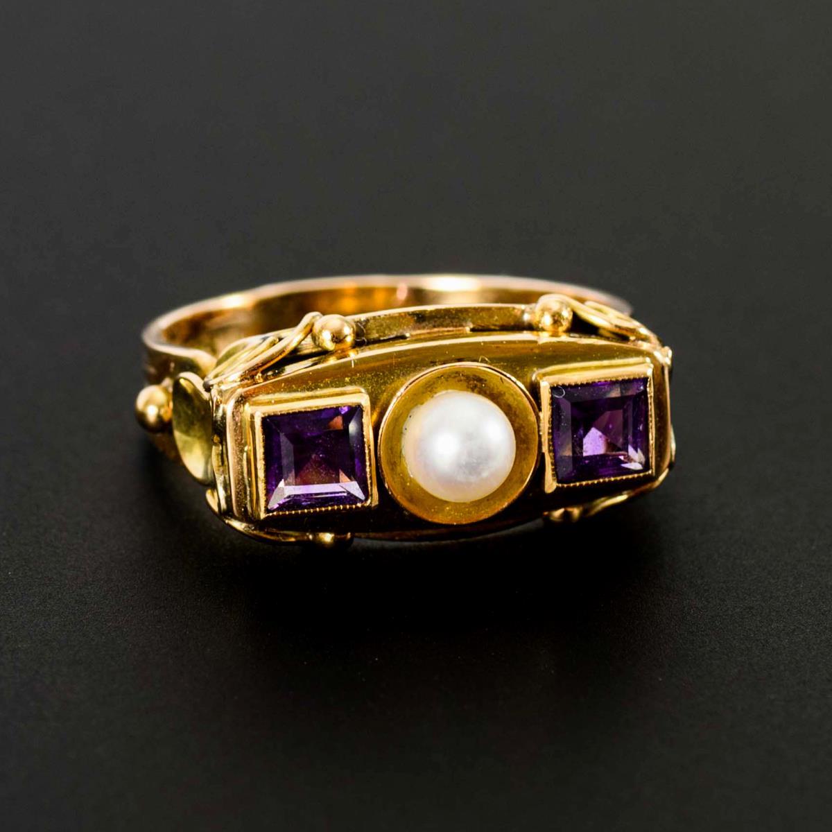 Zuchtperle und 2 zargengefasste Amethystcarrés in spiral- und granalienverziertem Rahmen, zwischen mittlerer Schiene.