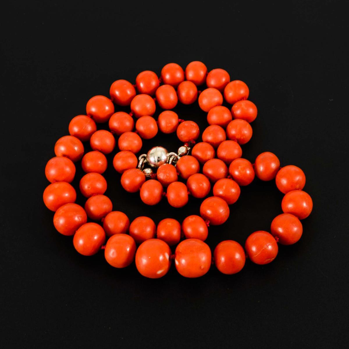 Schnürkette mit Korallenkugeln, einzelverknotet im Verlauf, an Magnet-Kugelschließe.