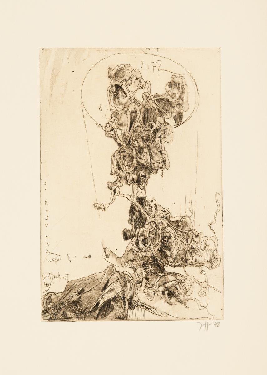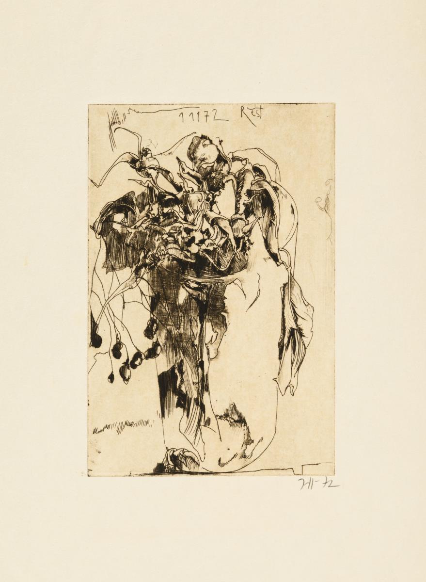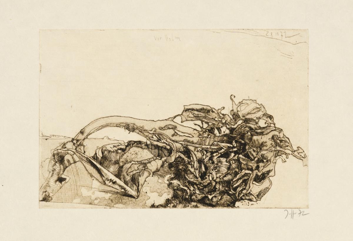 "Kopfweide", Griffelkunst 1974 | "Ein Glas mit vertrockneten Weintrauben", Griffelkunst 1972 | Ohne Titel, Griffelkunst 1975 | Ohne Titel, [19]71 | "Knochen eines Vereinsmitgliedes", Griffelkunst 1972 | "Tantchen Memo", Griffelkunst Sonderblatt 1971 | Selbstbildnis "Blückers Gedächtnis", Griffelkunst 1972 | "Vor Holm", Griffelkunst 1972 | "Rest", Griffelkunst 1972 | Ohne Titel, Griffelkunst 1972.
