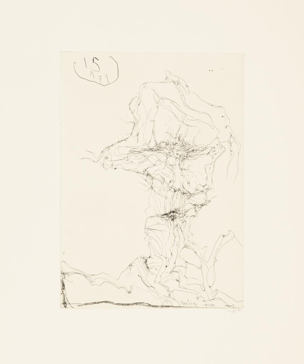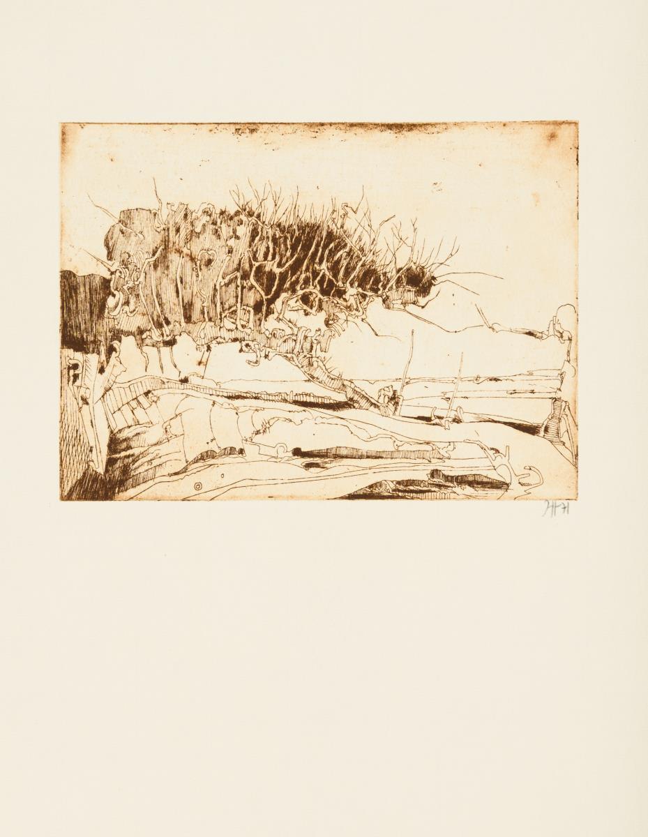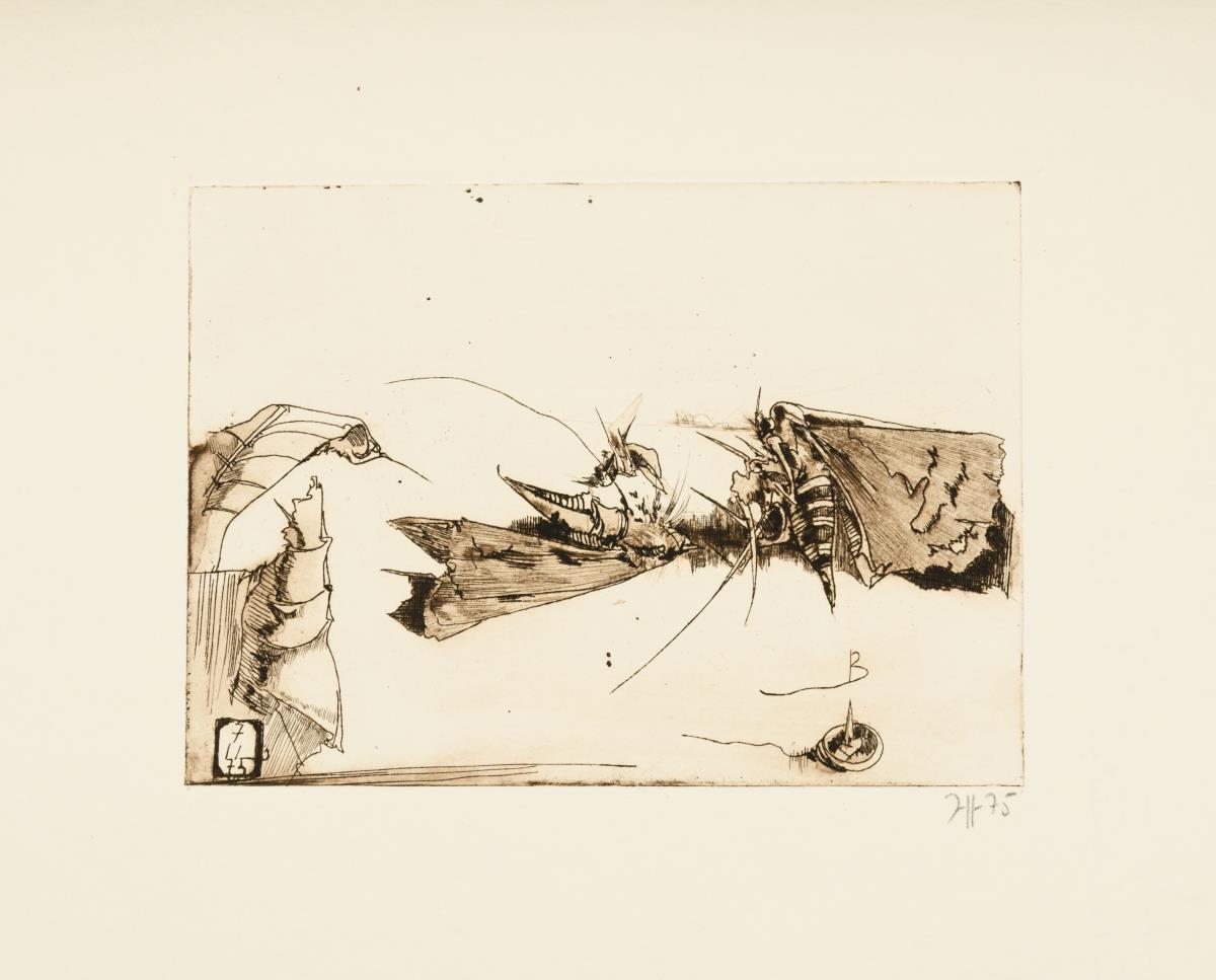 "Kopfweide", Griffelkunst 1974 | "Ein Glas mit vertrockneten Weintrauben", Griffelkunst 1972 | Ohne Titel, Griffelkunst 1975 | Ohne Titel, [19]71 | "Knochen eines Vereinsmitgliedes", Griffelkunst 1972 | "Tantchen Memo", Griffelkunst Sonderblatt 1971 | Selbstbildnis "Blückers Gedächtnis", Griffelkunst 1972 | "Vor Holm", Griffelkunst 1972 | "Rest", Griffelkunst 1972 | Ohne Titel, Griffelkunst 1972.