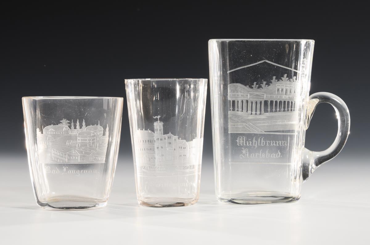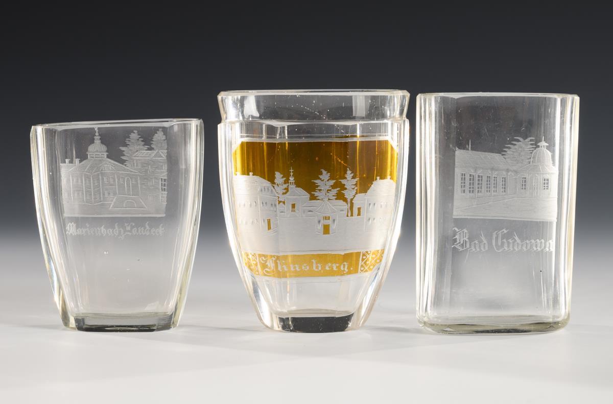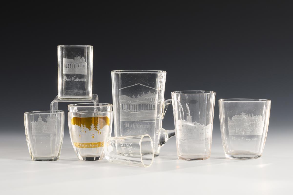 Verschiedene facettierte Plattbecher mit gravierten Ansichten. 1x Chip und Beschleifung am Mündungsrand, partiell minimale Bestoßungen am Mündungsrand.