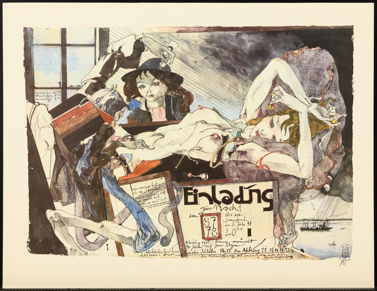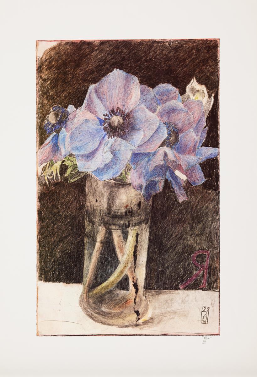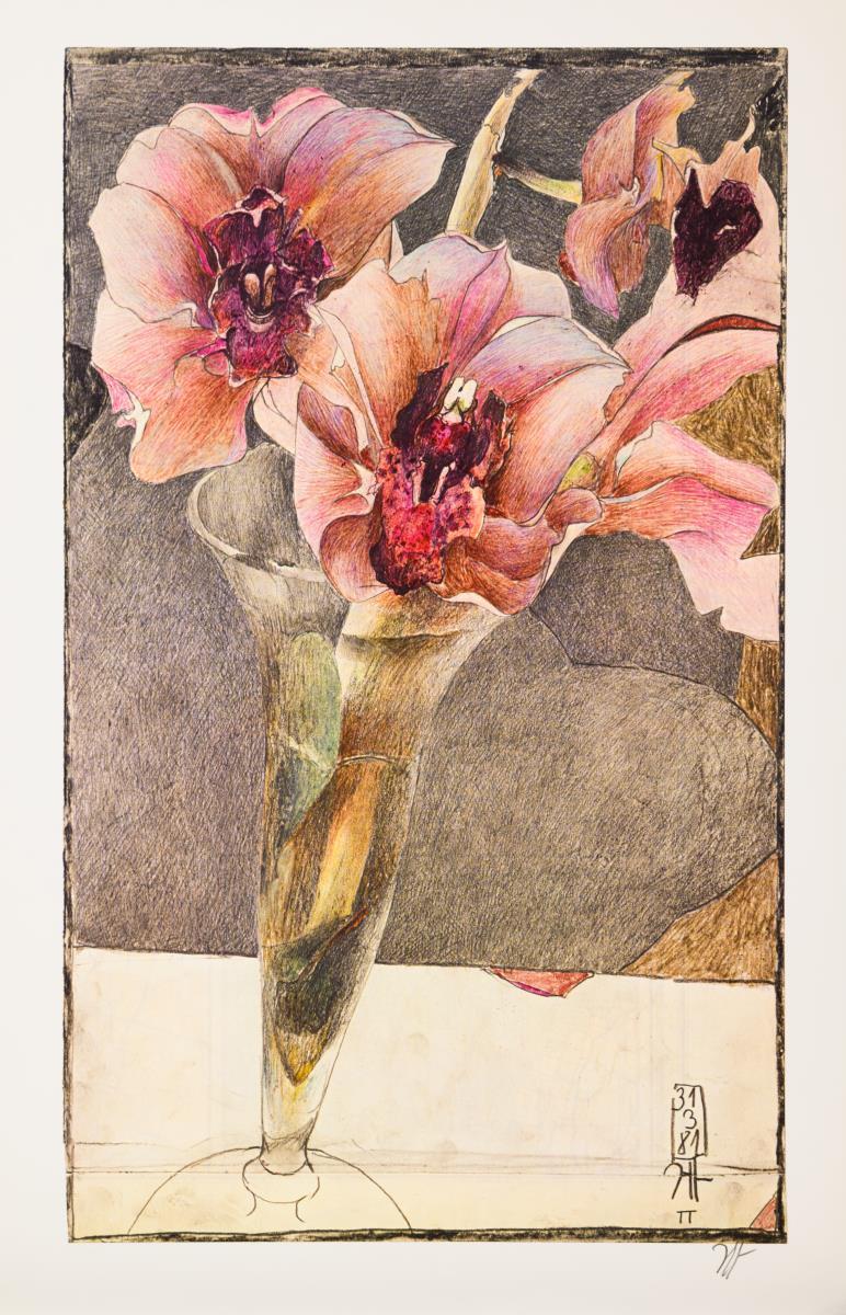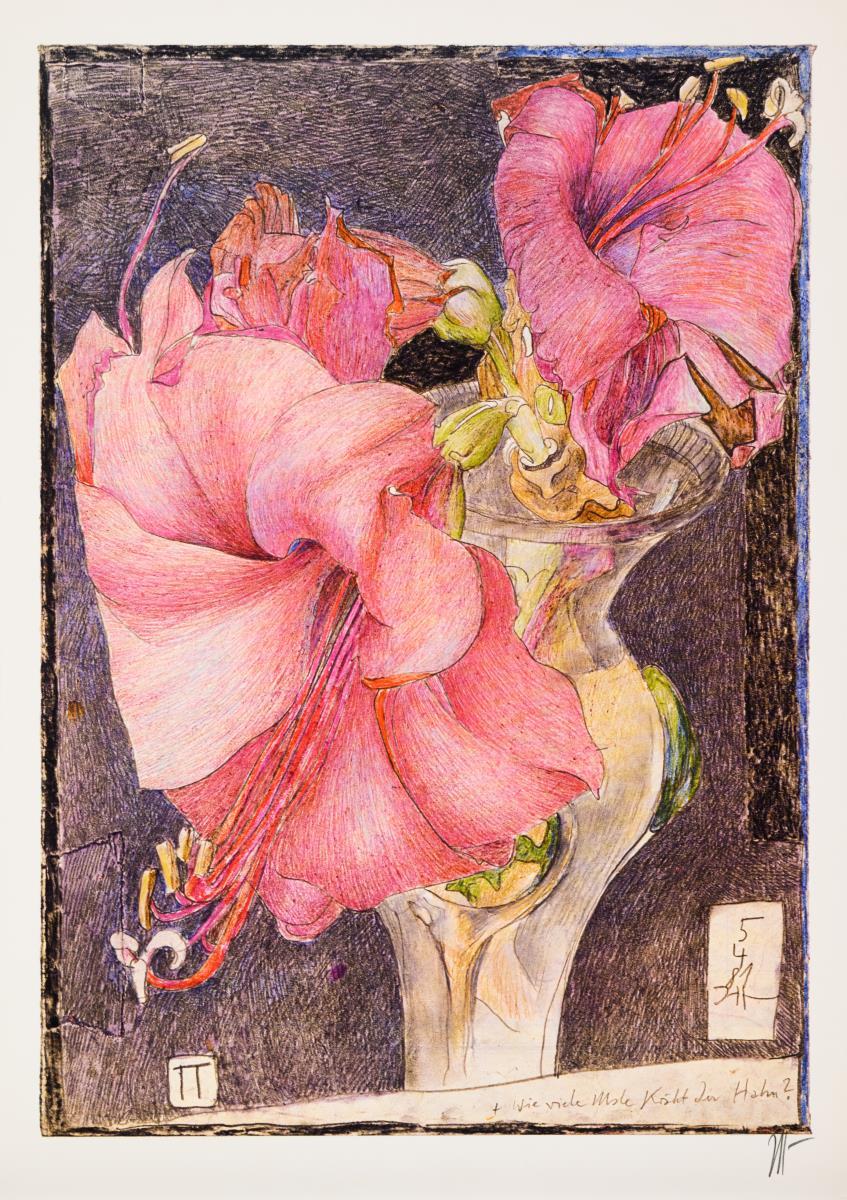 "Mein erstes französisches Gedicht", im Druck datiert: 1986, etwas knickspurig | "Einladung zur Nacht", im Druck datiert: 1978, etwas knickspurig | 4 verschiedene Blumenstillleben (davon 2 zu "Tocka - Schwermut"), je im Druck datiert: 1981.