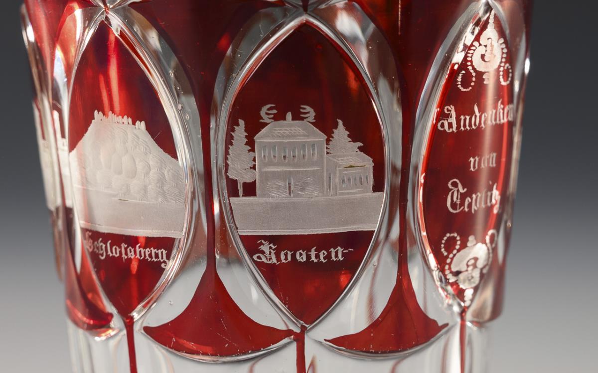 2 Fußbecher aus farblosem Glas mit rotem Überfang: 1x mit floralem Schliffdekor und einer gravierten Ansicht von Salzbrunn; 1x mit Kerb- und Facettenschliff und gravierten Ansichten von Teplitz. / 1 Becher aus farblosem Glas mit grünem Überfang, Linsenschliff und goldgemaltem Ornamentdekor. 1x Gold berieben, 1x mit minimalen Randbestoßungen.