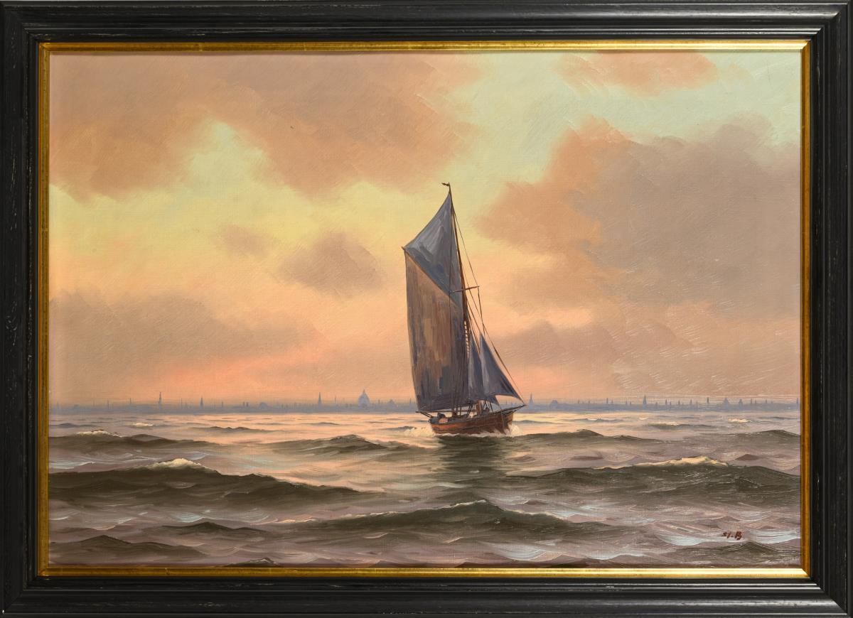 Segler wohl in der Meerenge Öresund mit Blick auf die Stadt an der Küste. Minimale Altersspuren.