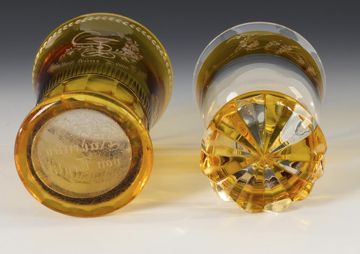 Farbloses, gelb gebeiztes Glas. H 13 und 12 cm.