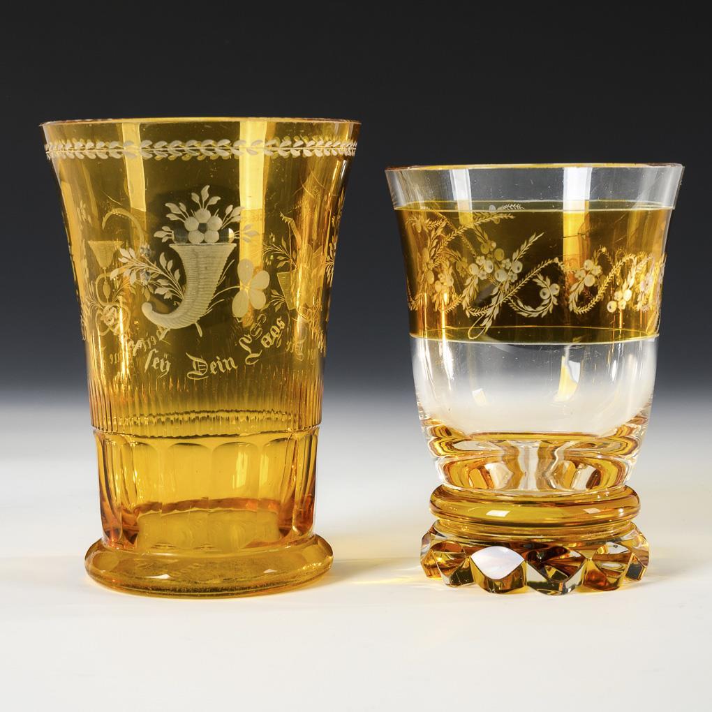 1x konischer, am Ansatz facettierter Freundschaftsbecher mit gravierten Symbolarrangements und den Wünschen "Gesundheit kröne deine Tage / Glück sei dein Los / Freude bringe dir die Zeit" sowie am Boden "Andenken an Teplitz". / 1x Glockenbecher mit mehrpassigem Fuß und der gravierten, aus Blatt- und Blütenranken gebildeten Aufschrift "Von Kissingen". Minimaler Randchip.