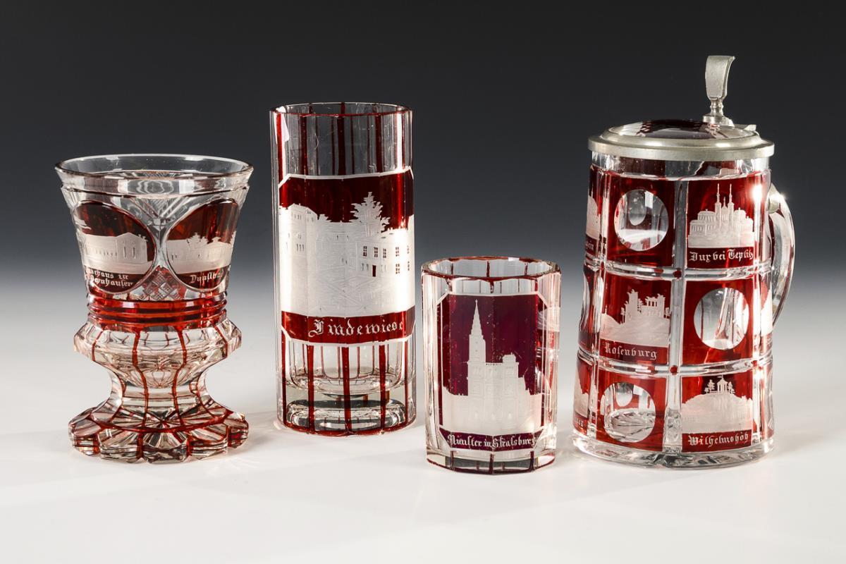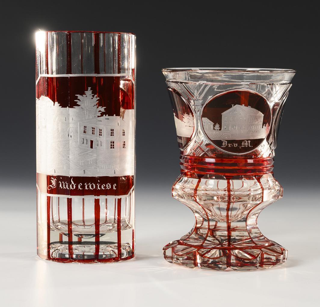 1x konischer Bierkrug mit Teplitzansichten (H 17 cm). / 2 facettierte Bechergläser, 1x mit der Ansicht "Lindewiese" und 1x mit einer Ansicht des Münsters in Straßburg (H 14,5 und 8,5 m). / 1x teils facettiertes Kelchglas mit Ansichten von Bad Oeynhausen (H 13 cm). Minimale Bestoßungen am Rand des kleinen Bechers.