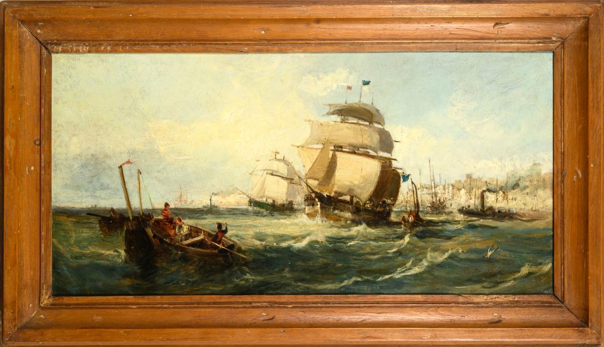 Mehrere Schiffe vor der Küstenstadt bei stärkerem Wellengang. Leinwand doubliert.