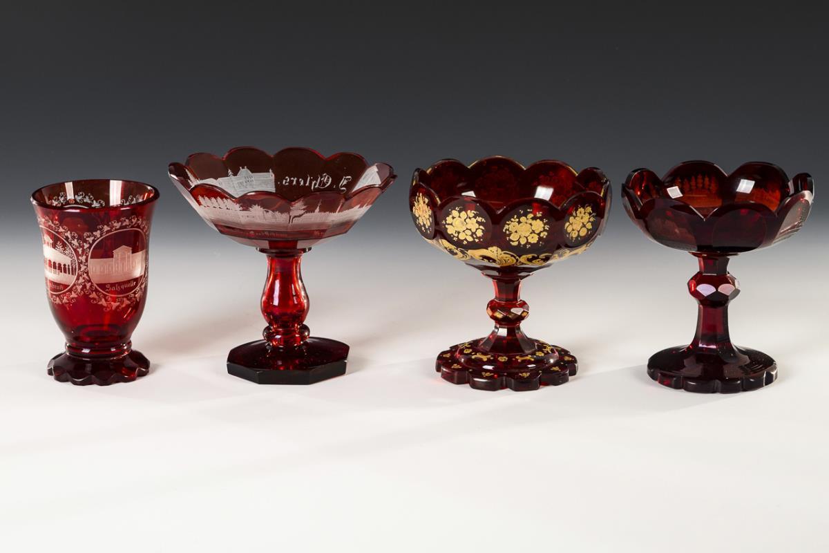 3 verschiedene Fußschalen: 2x mit gravierten Ansichten (Bad Pyrmont und Hannover), 1x mit floraler Email- und Goldmalerei (H 14-14,5 cm). / 1 Kelchglas mit gravierten Ansichten von Franzensbad (H 13 cm). Gold berieben, kleine Bestoßung am Fußrand einer Fußschale.