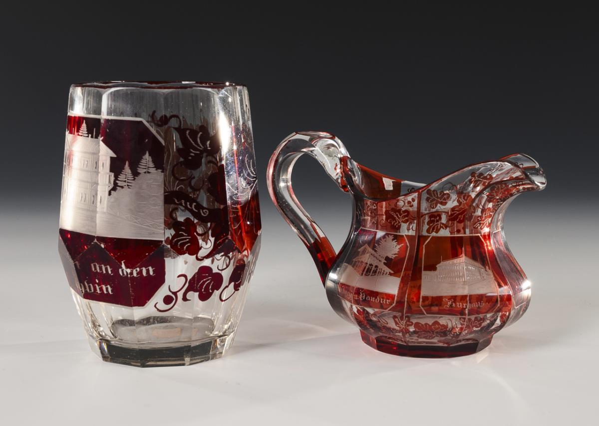 Milchkännchen mit Ansichten von Bad Kissingen. / Facettierter Becher mit Oybin-Ansicht. / 2 verschiedene Kelchgläser mit Ansichten von Bad Oeynhausen bzw. Bentheim. Spannungsriss im Henkel des Milchkännchens.