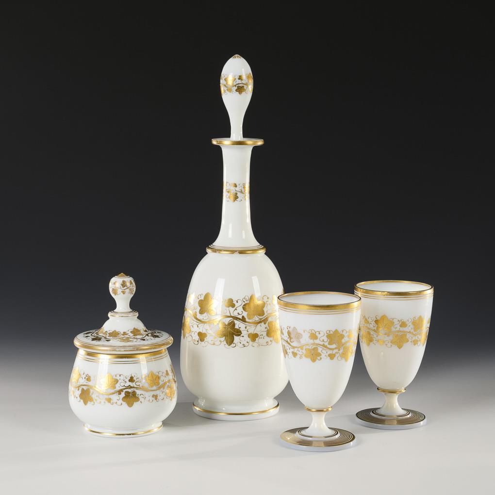 Schlanke Karaffe (H 34 cm), 2 Kelchgläser (H 13 cm) und Zuckerdose (H 14 cm). Alle mit einem umlaufenden Weinrebenkranz. Partiell minimaler Goldabrieb, minimale Bestoßung am Innenrand der Zuckerdose, 1 minimaler Chip am Mündungsrand eines Kelchglases.