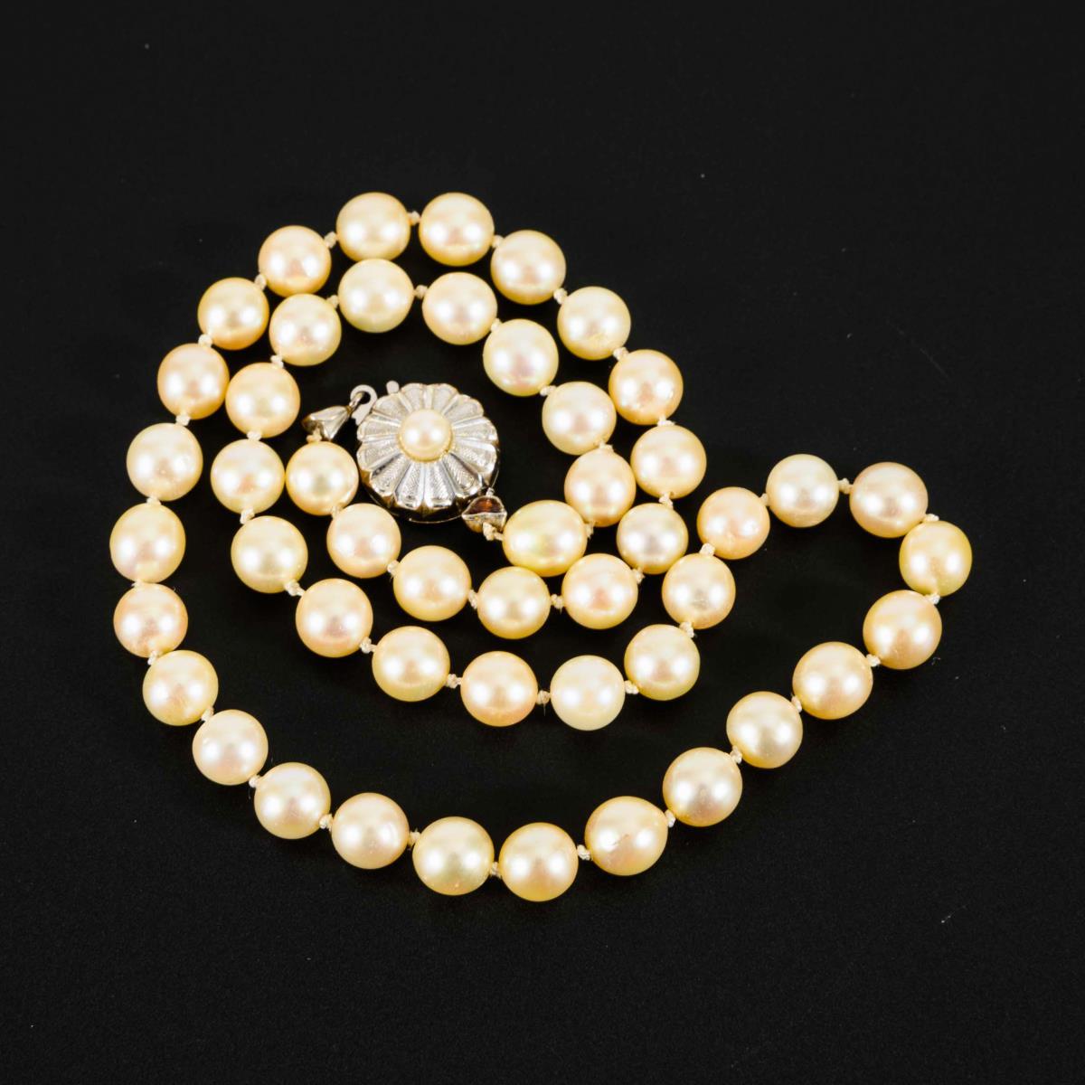 Gelbgold/Weißgoldschließe 585 gestempelt. Perlen Ø 6,5 mm. Kette L 42 cm. 23,8 g.