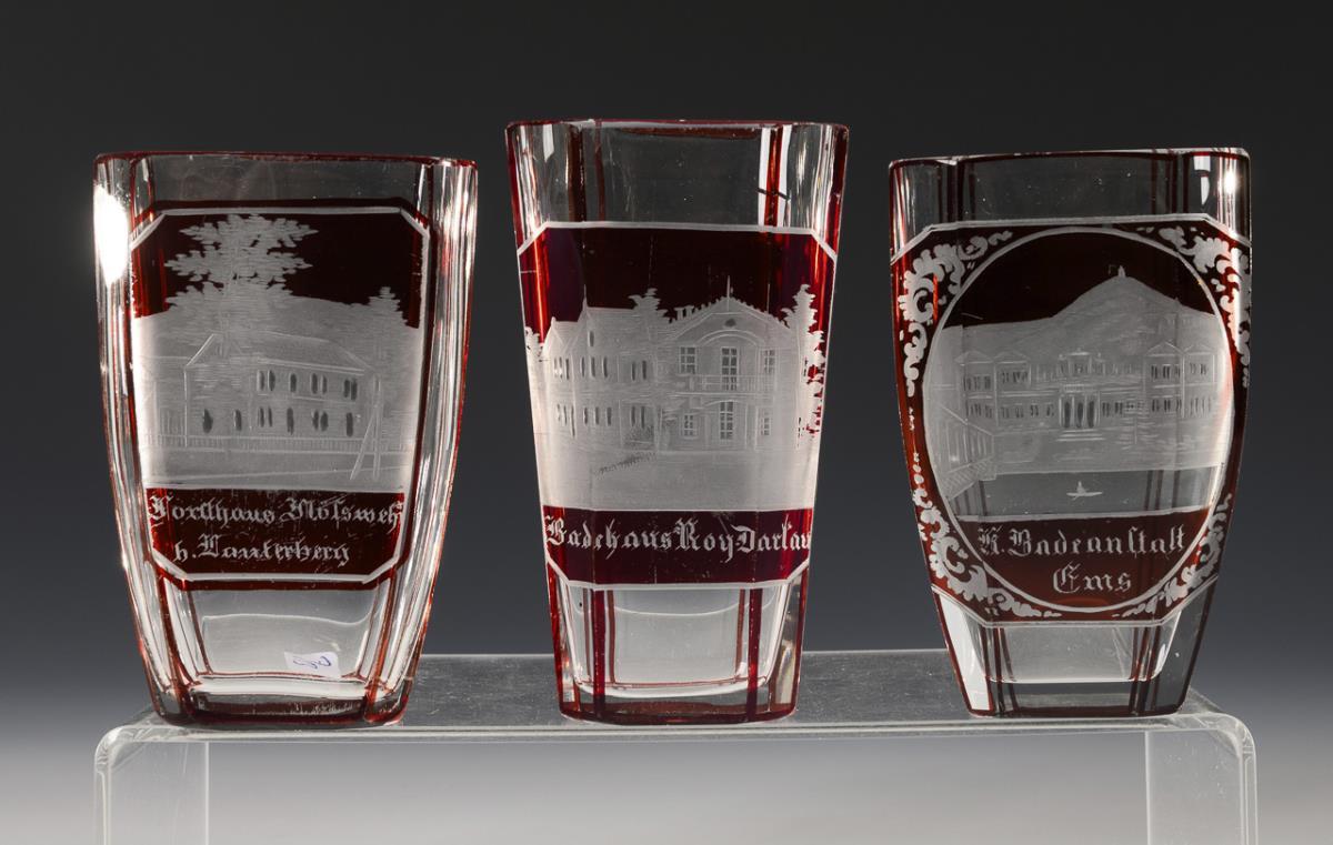 Überwiegend facettierte Plattbecher: 6x mit gravierten Ansichten (u.a. Wiesbaden, Bad Ems, Polenthal), 1x mit der Aufschrift "Auch auf dem Kuhstall dacht ich Dein". Teile etwas berieben, partiell minimale Bestoßungen am Mündungsrand.