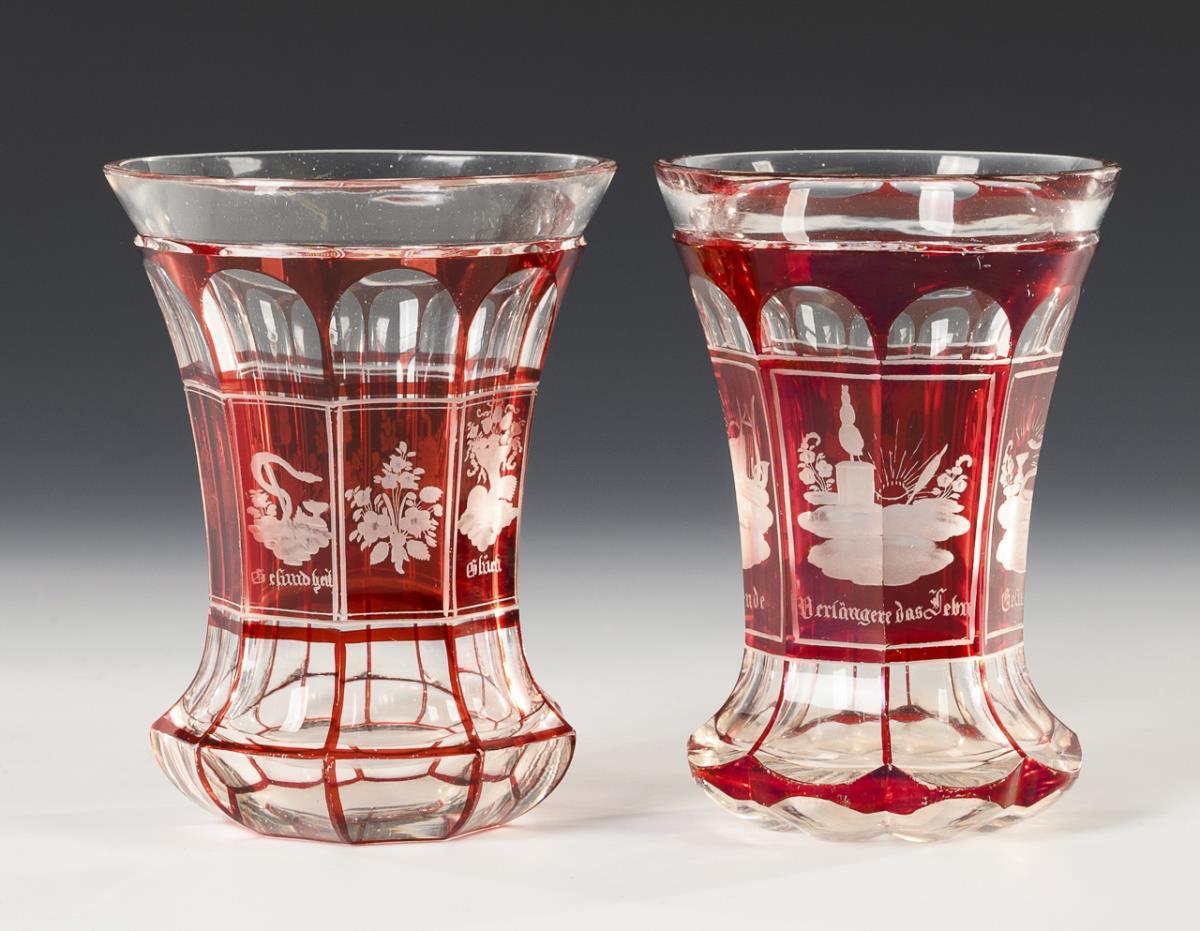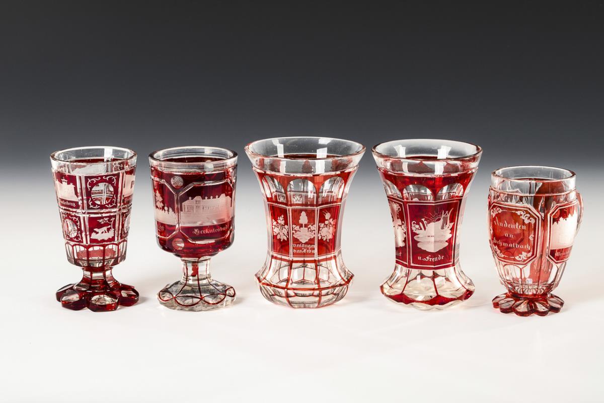 1 Henkelbecher und 2 Kelchgläser mit gravierten Ansichten (Franzensbad, Sächsische Schweiz, Schwalbach). / 2 Freundschaftsbecher mit gravierten Symbolarrangements. 1x Bestoßung am Mündungsrand.