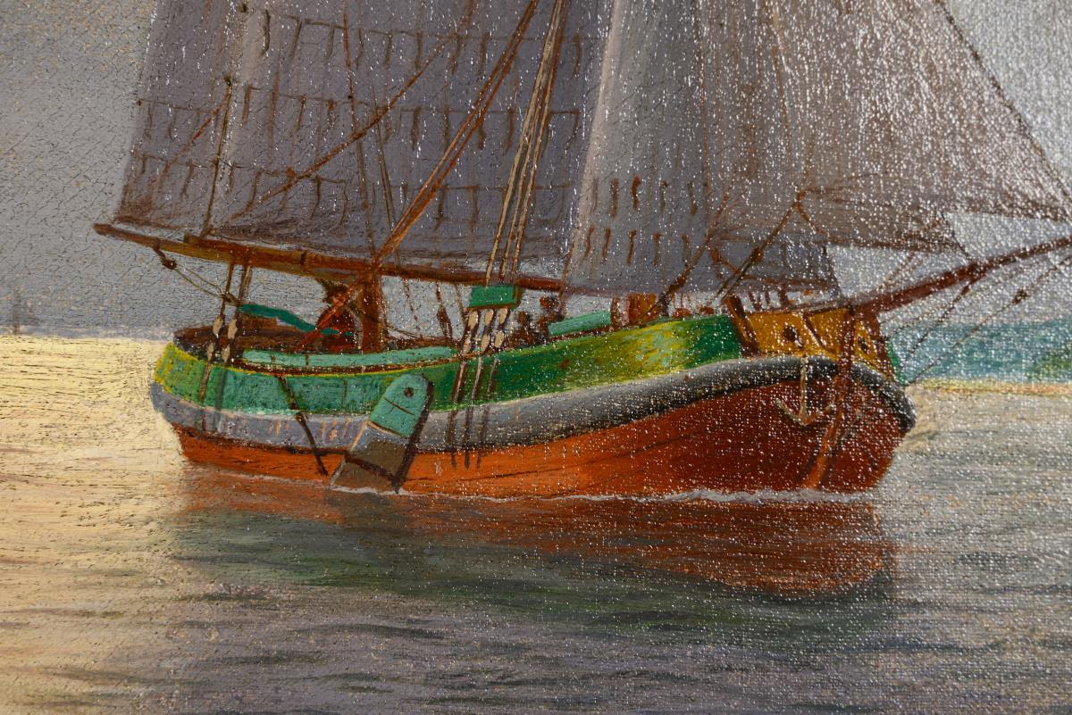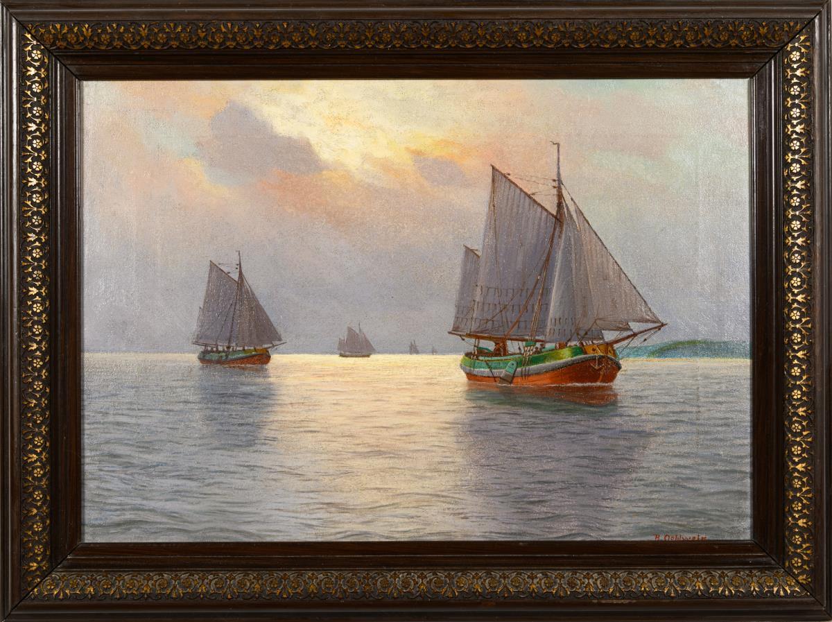 Mehrere Segler auf dem ruhigen Wasser nahe einer Küste. Leichte Altersspuren.