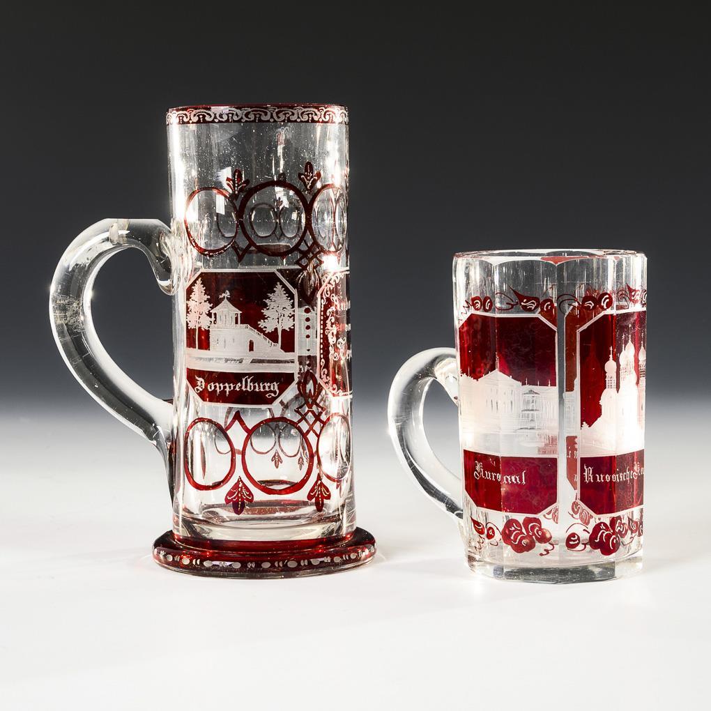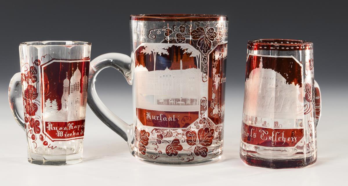 5 verschiedene Krüge mit gravierten Ansichten (Wiesbaden, Teplitz, Tetschen).