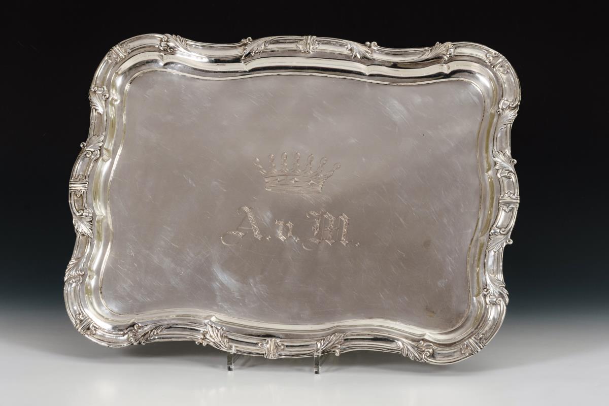 Rechteckiges, leicht geschweiftes Tablett mit reliefiertem Rand und bekrönter