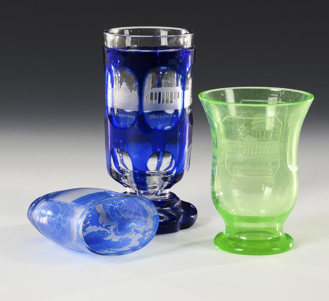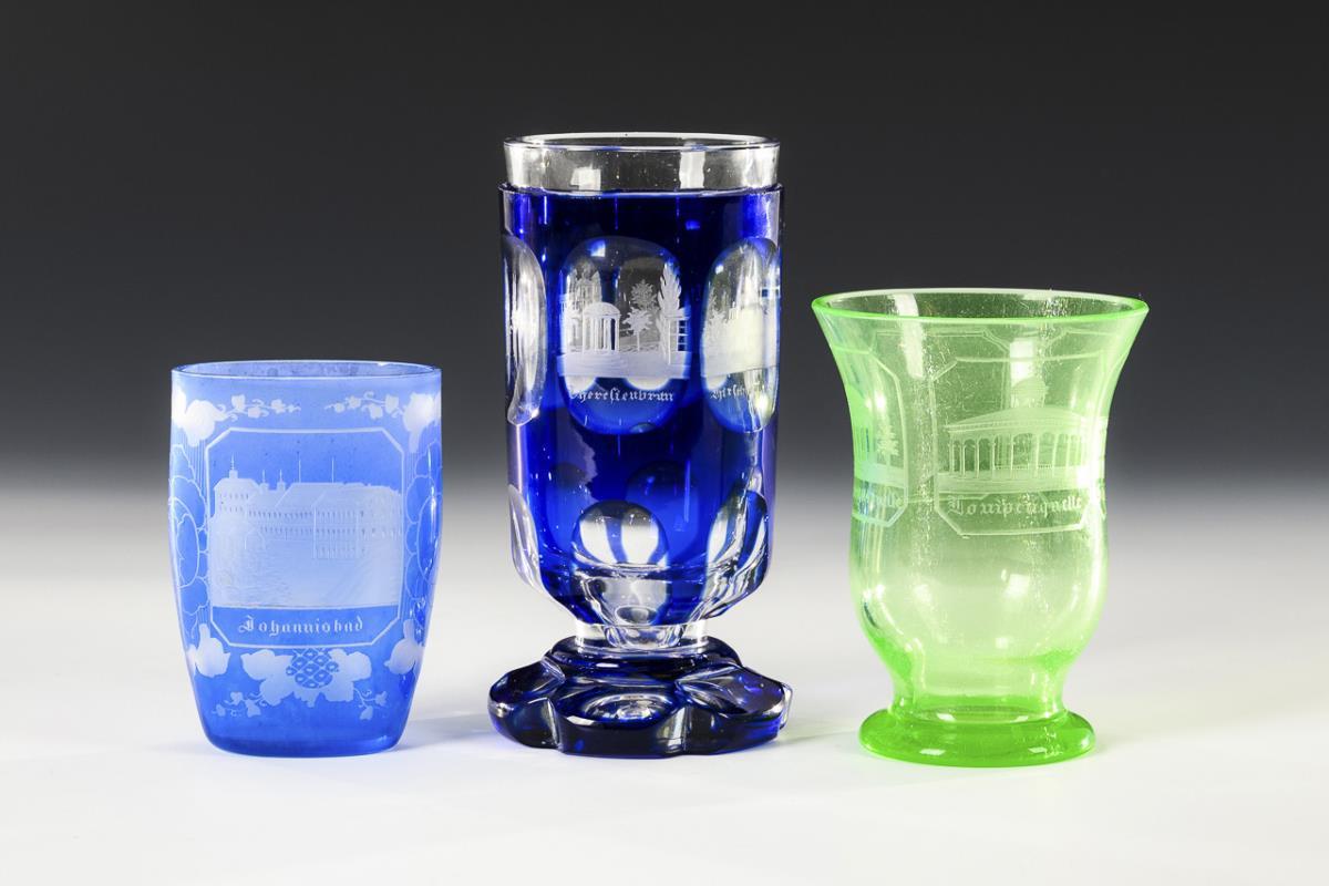 1x Kelchglas aus farblosem Glas mit kobaltblauem Überfang, Oliven- und Facettenschliff sowie Ansichten von Karlsbad (H 16,5 cm). / 1x Uranglas-Kelchglas mit Ansichten von Franzensbad (H 12 cm). / 1x blau lasierter Plattbecher mit einer Ansicht von Johannisbad (H 10,5 cm). Uranglas glaskrank.