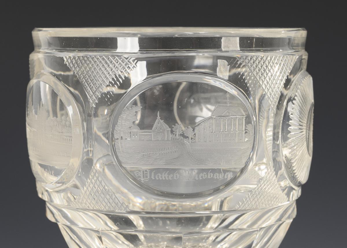 1x Zuckerschale (H 12,5 cm). / 1x Ranftbecher (H 12,5 cm). / 1x Kelchglas mit Ansichten von Wiesbaden (H 13,5 cm). Alle mit reichem Kerb- und Steinelschliffdekor. 2 Fußränder minimal bestoßen.