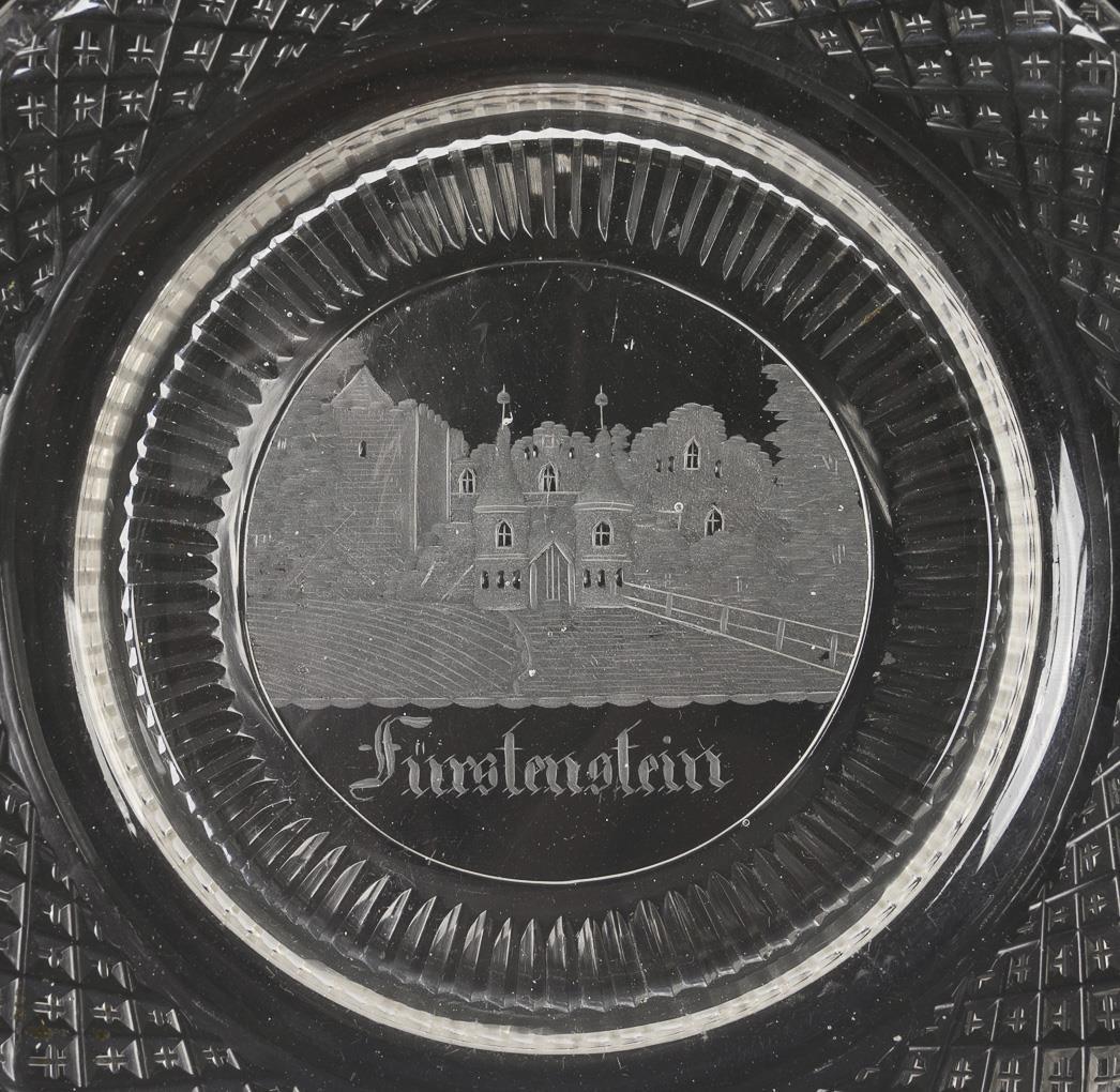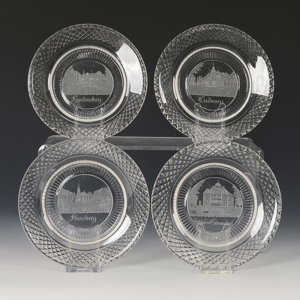 Kuchenteller mit Kerb- und Steinelschliff, im Spiegel je eine gravierte Ansicht (Flinsburg, Erdmannsdorf, Fürstenstein, Cudowa).