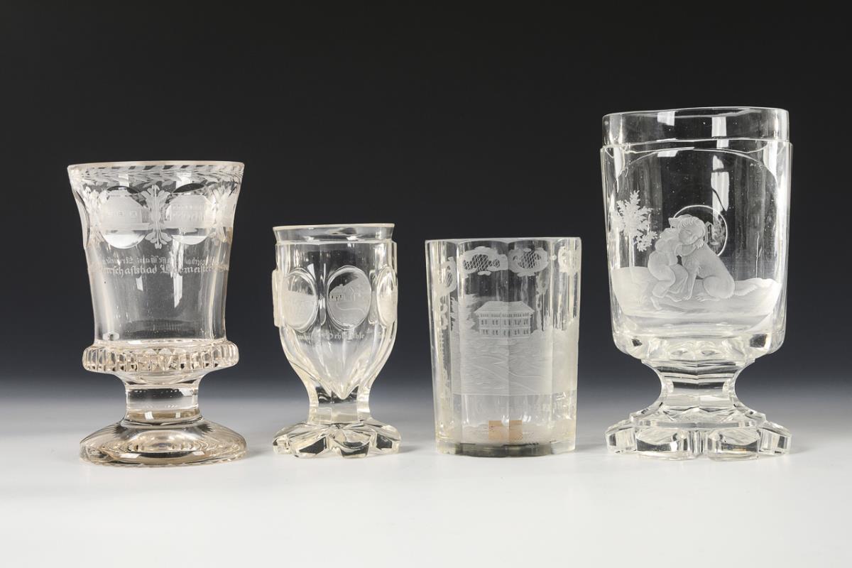 2 verschiedene Kelchgläser und 1 facettierter Zylinderbecher mit gravierten Ansichten (Teplitz, Bad Kissingen, Lippspringe) (H 10-13,5 cm). / 1x Kelchglas mit facettierter Zylinderkuppa, facettiertem Schaft und mehrpassigem Fuß, schauseitig die tiefgeschnittene Darstellung eines Knaben, einen Hund umarmend (H 15,5 cm). 1x Beschleifung am Fußrand.