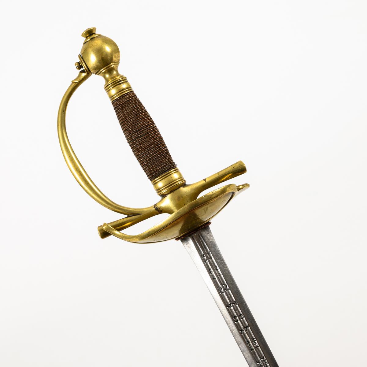 Gerade zweischneidige Klinge, mit zwei schmalen Hohlschliffen im unteren Viertel. In diesen beidseitig je zweimal ", "xxx EN TOLEDO xx", dabei einige Buchstaben durch Zeichen ersetzt. Herzförmiges, leicht gewölbtes Messing-Stichblatt mit Muschelende, gerade Parierstange, durch ein Ende des Stichblattes ragend. Kugelknauf. Griff aus feiner Drahtwicklung. Schwarze Lederscheide mit loser Spitzenhülse.