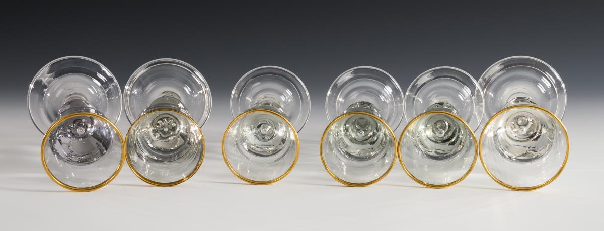 Konische Kelche, 4x mit eingestochener Luftblase und 2x mit eingestochenem Luftblasenkranz im massiven Boden, Balusterschäfte mit eingestochener Luftblase, Glockenfüße mit umgeschlagenem Rand; teils ausgekugelter Abriss.