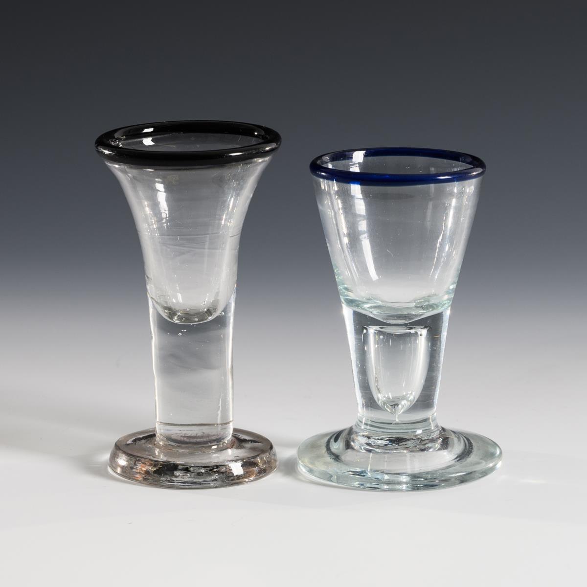 1x konische Kuppa, massiver Schaft mit eingestochener Luftblase, Rundfuß. / 1x Trichterkuppa, massiver Schaft, Rundfuß. Beide mit Abriss.