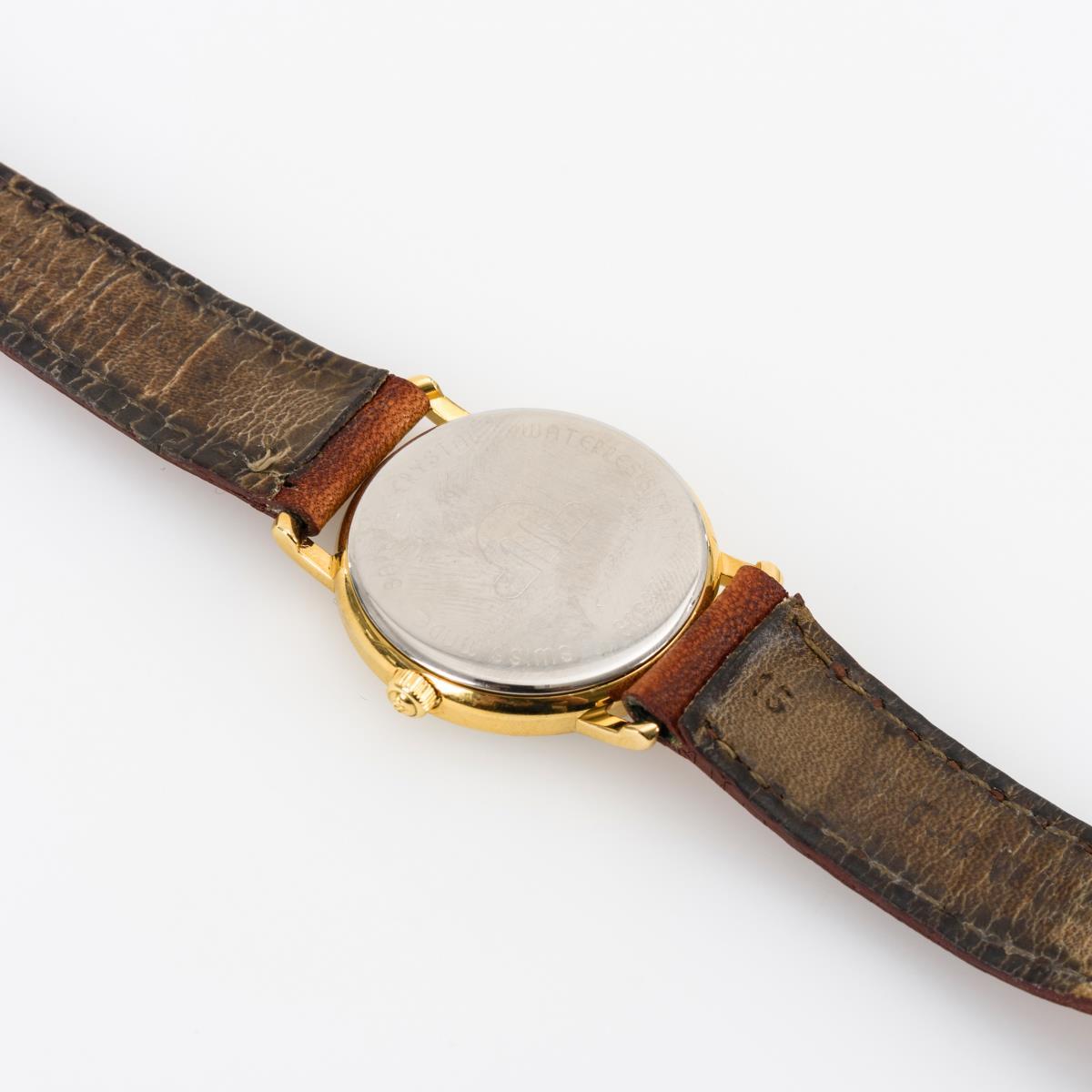Rundes Gehäuse an braunem Lederband. Läuft. Minimale Gebrauchsspuren.