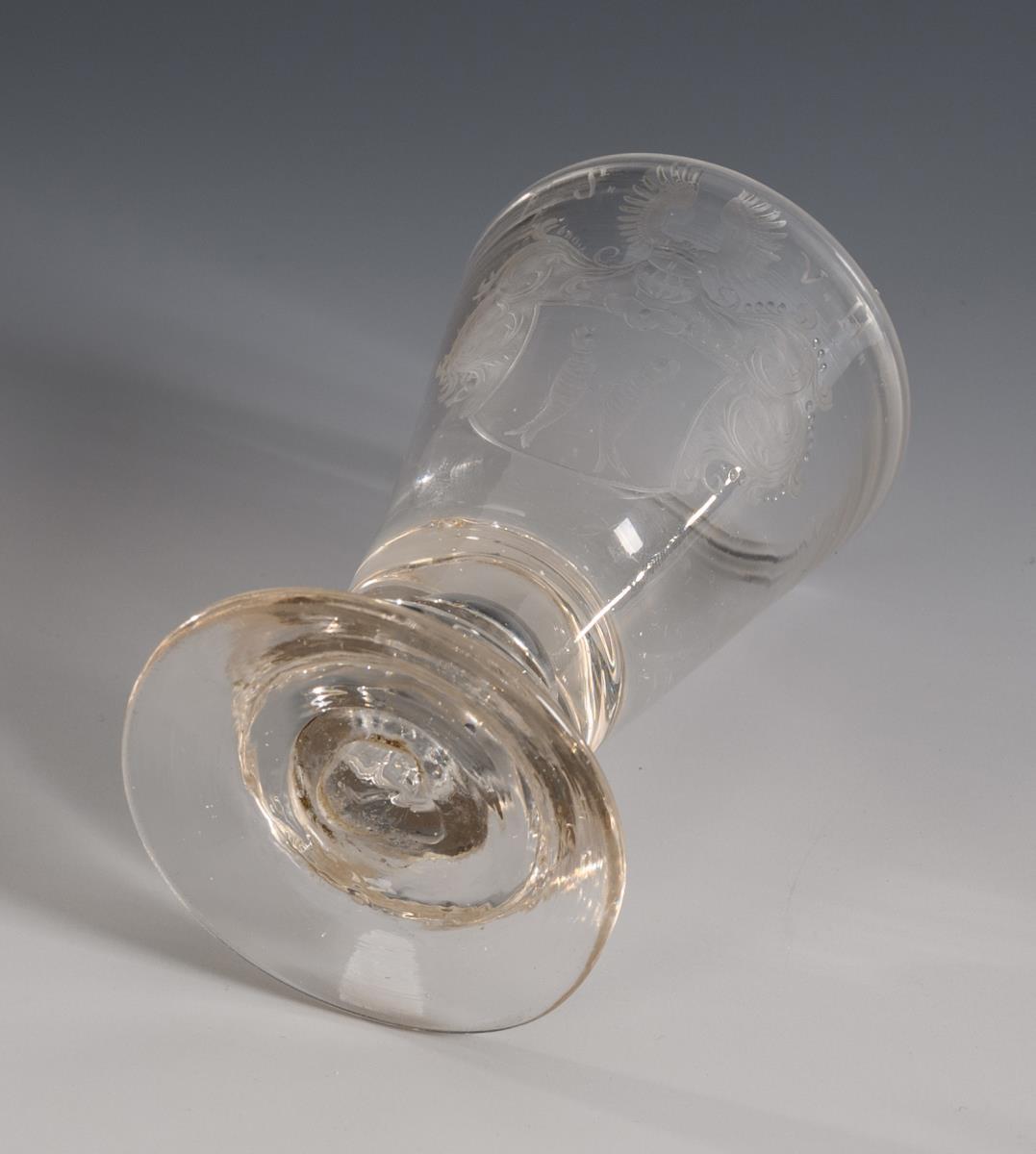 Branntweinglas mit konischem, in den massiven Schaft mit eingestochener Luftblase übergehenden Kelch, Rundfuß; Abriss. Schauseitig das gravierte Wappen von Saalfeld, darüber das Monogramm "E. S. v. H.".