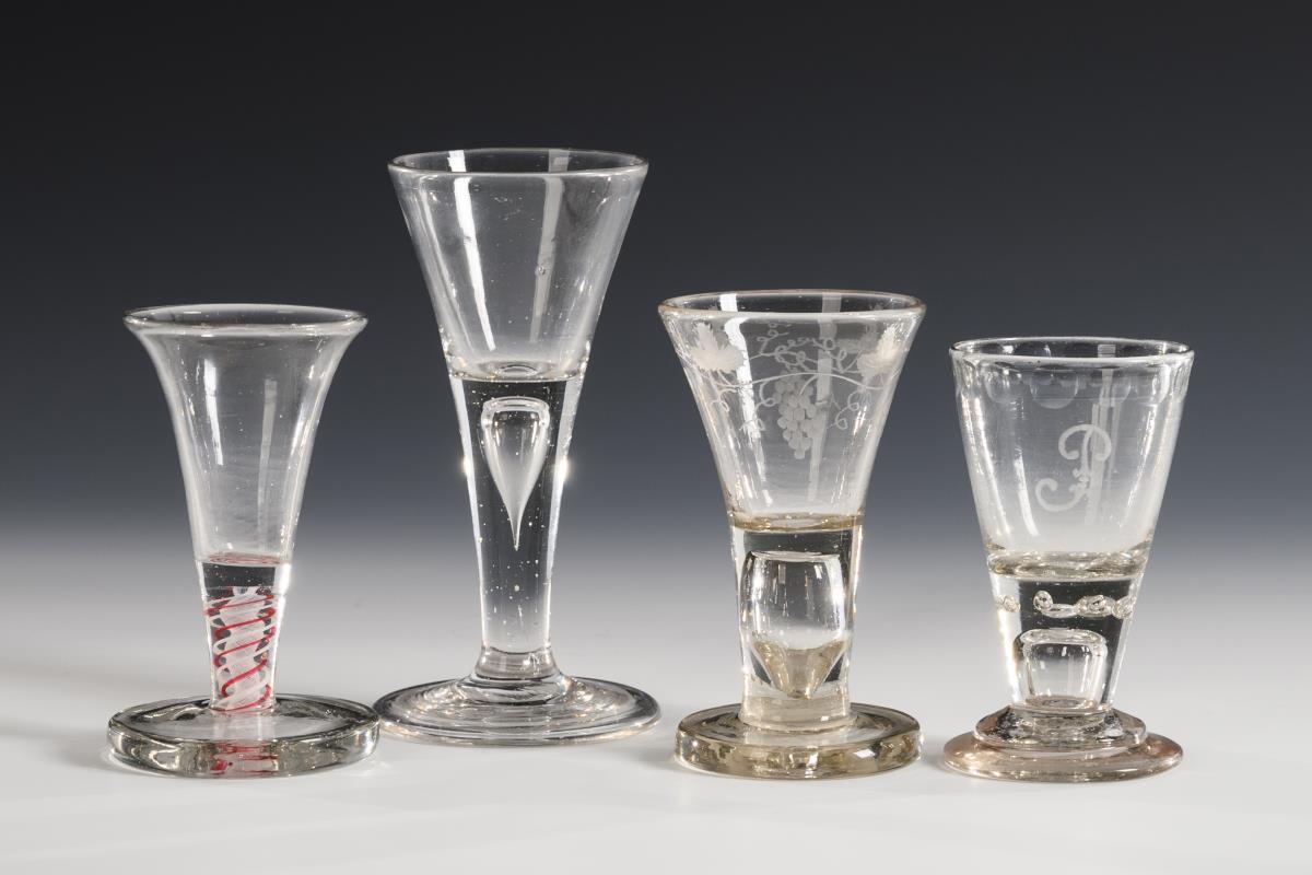 1x Kelchglas mit tropfenförmiger Luftblase im massivem Schaft und Rundfuß mit umgeschlagenem Rand (H 15 cm). / 1x Fadenglas mit Trichterkuppa und in den massiven Schaft eingeschmolzenem rot-weißen Spiralfaden (H 11,5 cm). / 1x mit Hohlschaft und gravierter Weinranke (H 12 cm). / 1x mit eingestochenem Luftblasenkranz und Hohlschaft, Kugelfries und dem Monogramm "JP" (H 10,5 cm).
