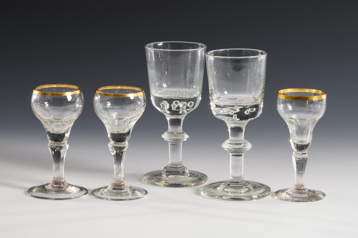 2 Weingläser mit konischer Kuppa, eingestochenem Luftblasenkranz im massiven Kuppaboden, nodiertem Schaft, Rundfuß; ausgekugelter Abriss (H 16 cm). / 3 Likörgläser mit bauchiger, am Ansatz facettierter Kuppa, facettiertem Schaft und Rundfuß (H 12 cm). Minimaler Goldabrieb, Füße der Weingläser mit Chip(s) in der Glasmasse.