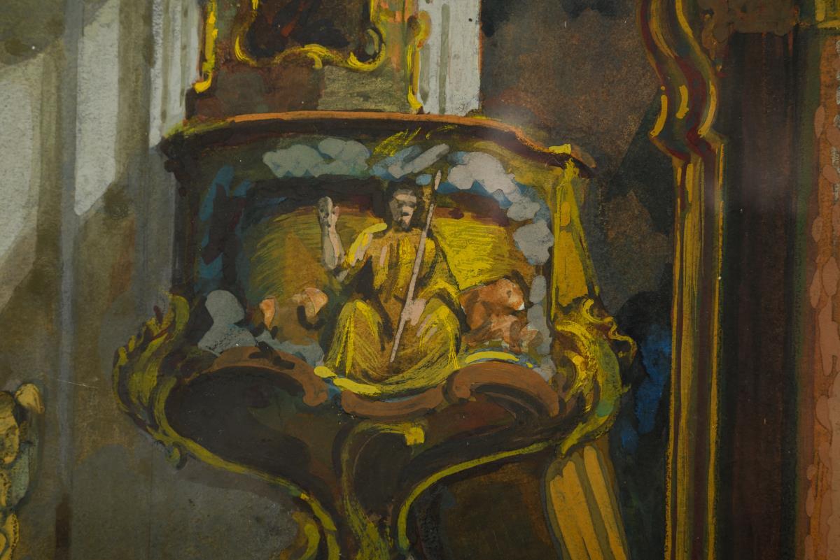 Innenansicht der barocken Kirche mit den Sitzbänken vor der Kanzel und einem Altar. Knicke und Nadellöcher in den Ecken.